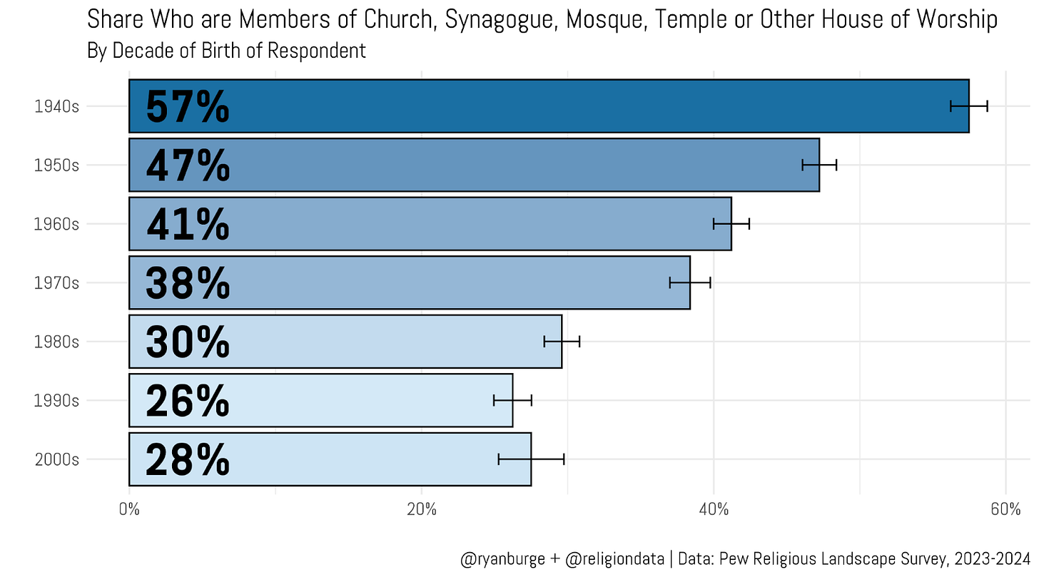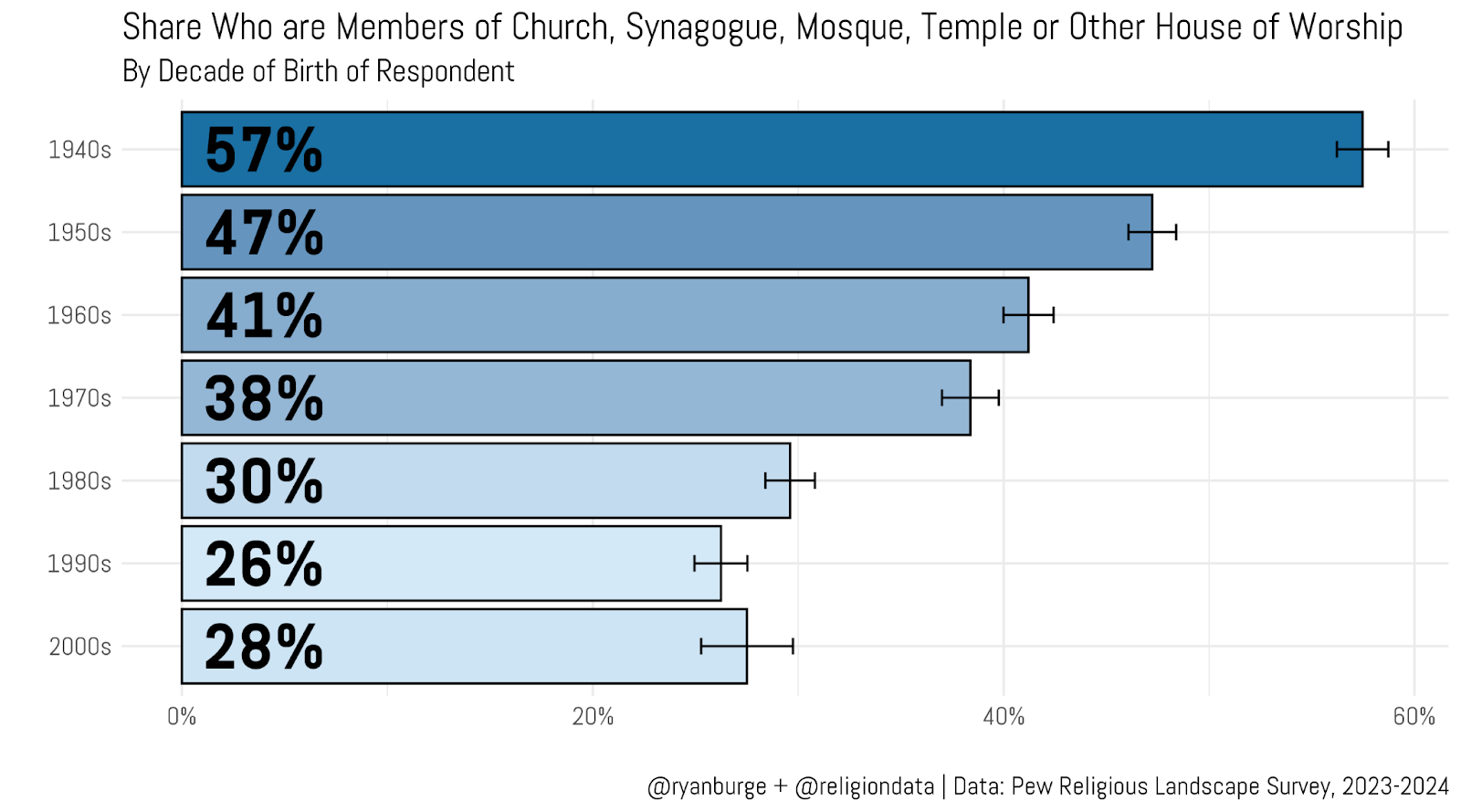 I mean, think about this simple fact: among religious people (of any faith background) born in 1980 or later a majority are not members of a church, synagogue, mosque, etc. It definitely feels like membership has fallen out of favor with younger folks, regardless of their faith background.