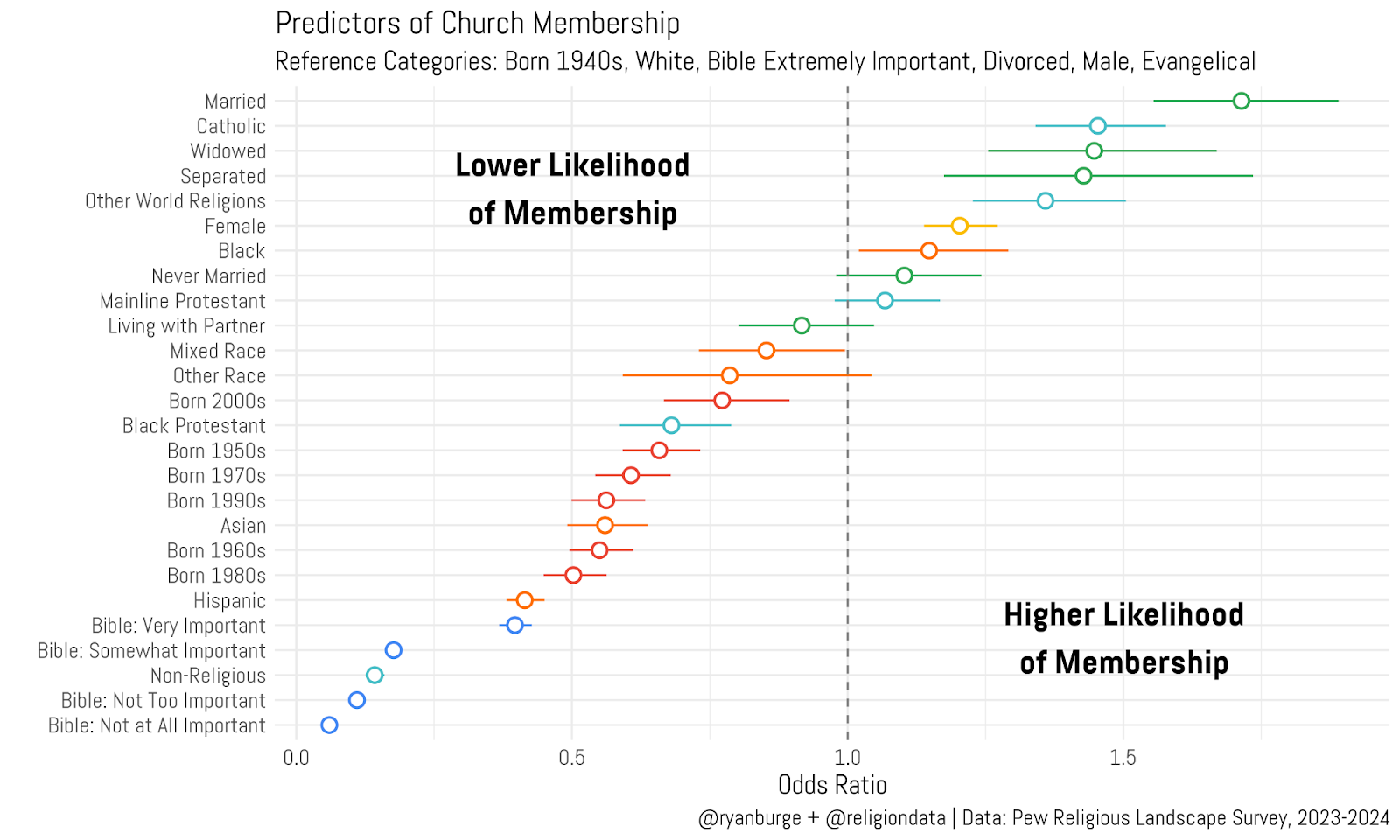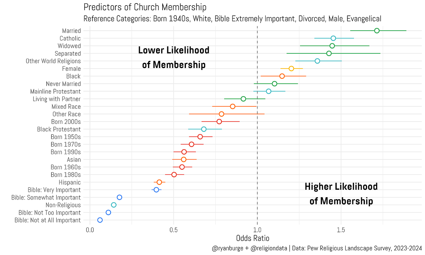 There is so much to explore with this question in order to figure out what factors drive church membership and the impact church membership can have on something like religious attendance.