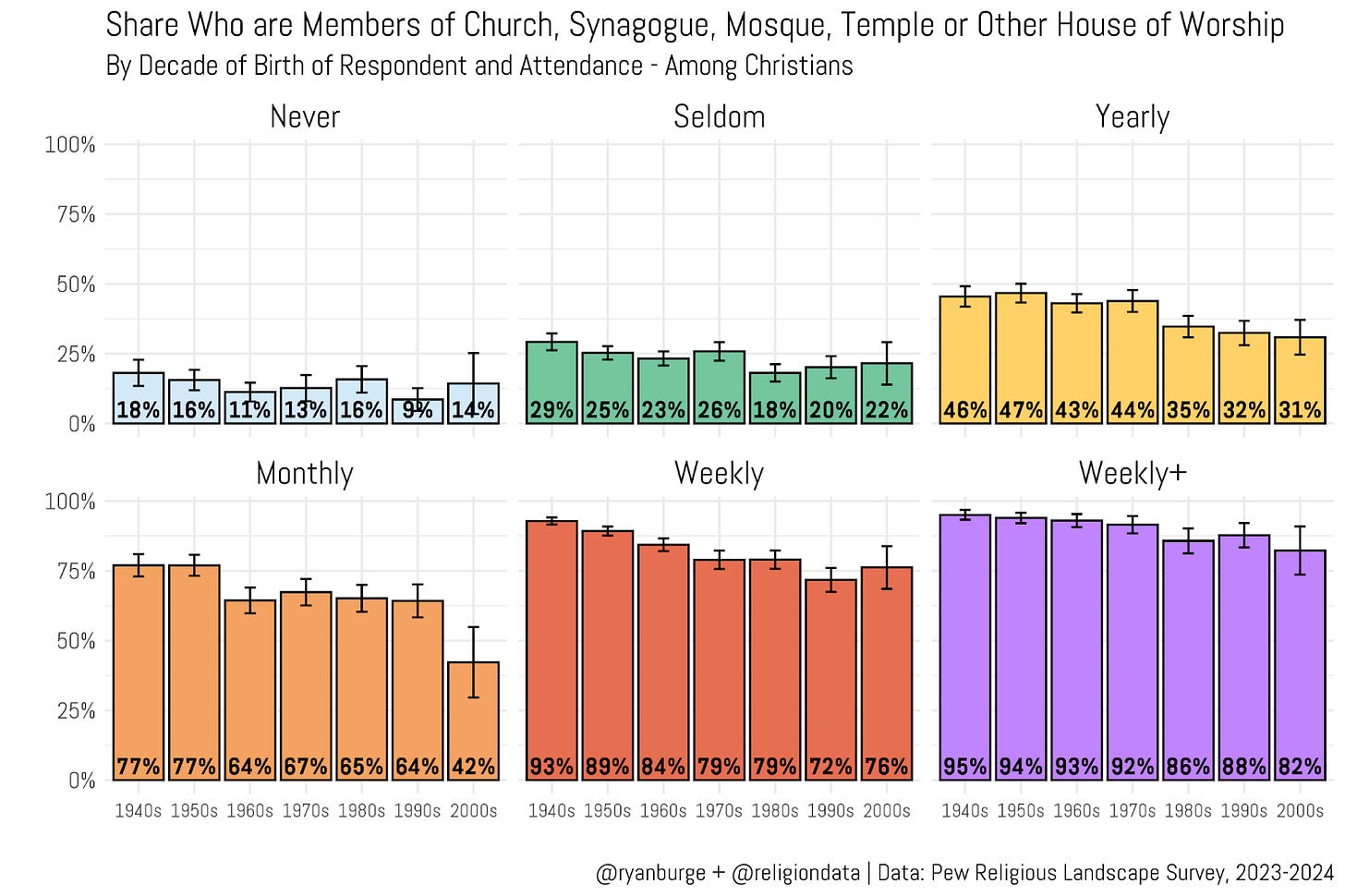 Among respondents born in the 1970s, membership rates drop to just 38% and then there’s this really noticeable inflection point in the data. For respondents born in 1980 or later, the share who are members of a house of worship drops to 25-30%. There is a bit of variation between the decades, but not a whole lot. I think it’s fair to say that the “floor” on this metric seems to be around 25% or so. Maybe the youngest adults will drop below that as they age through the life course, but it seems like the free fall has largely abated.