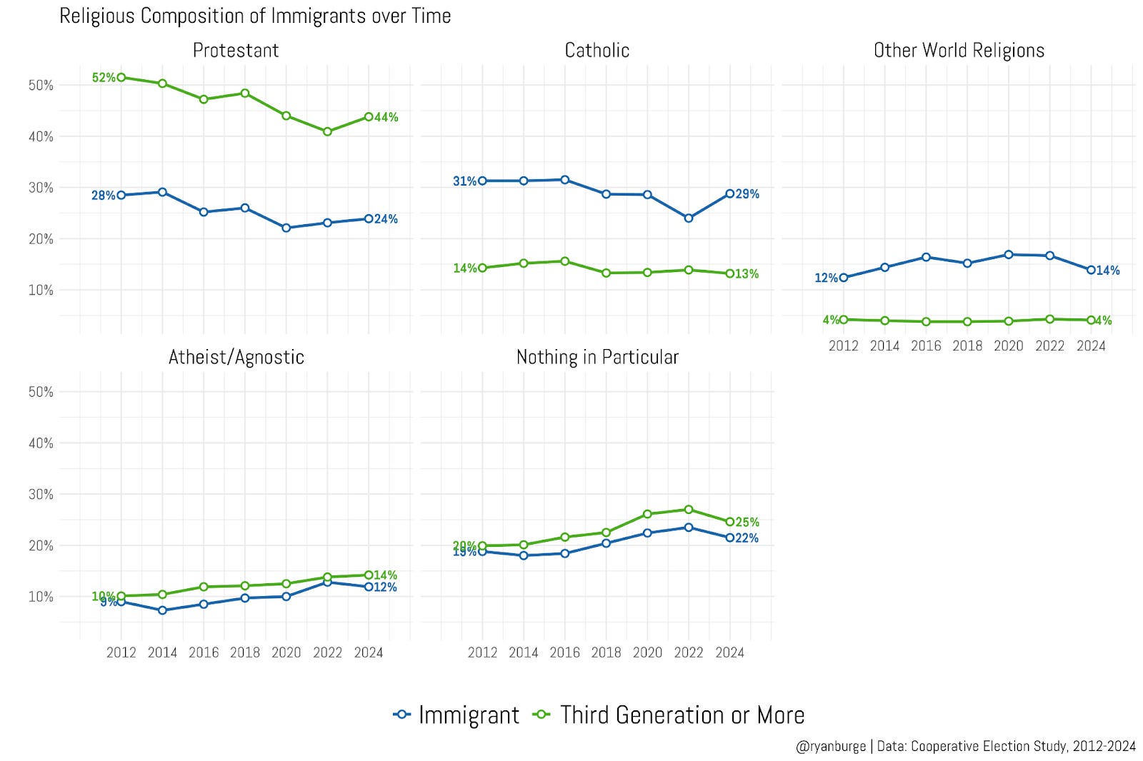 I like this graph because it generates a clear contrast between the two groups. Immigrants are just not very Protestant. In 2012, only 28% of folks who came to the United States said that they were Protestant. For those who had been in the United States for generations, it was 52%. Both groups are less likely to be Protestant now, but the overall gap has narrowed to about 20 points in the 2024 data. The Catholic share among immigrants is noticeably higher than folks who have been here for generations - 31% vs 14% back in 2012. Neither number has moved that much in the last decade.