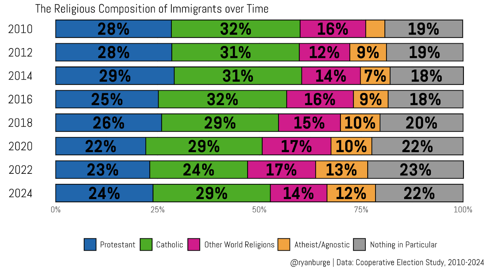 Remember, though, that the Cooperative Election Study has been asking this question about immigration status for decades. So I can use this data to figure out if immigrants from 2010 looked a lot different in terms of religious composition compared to immigrants from 2024.