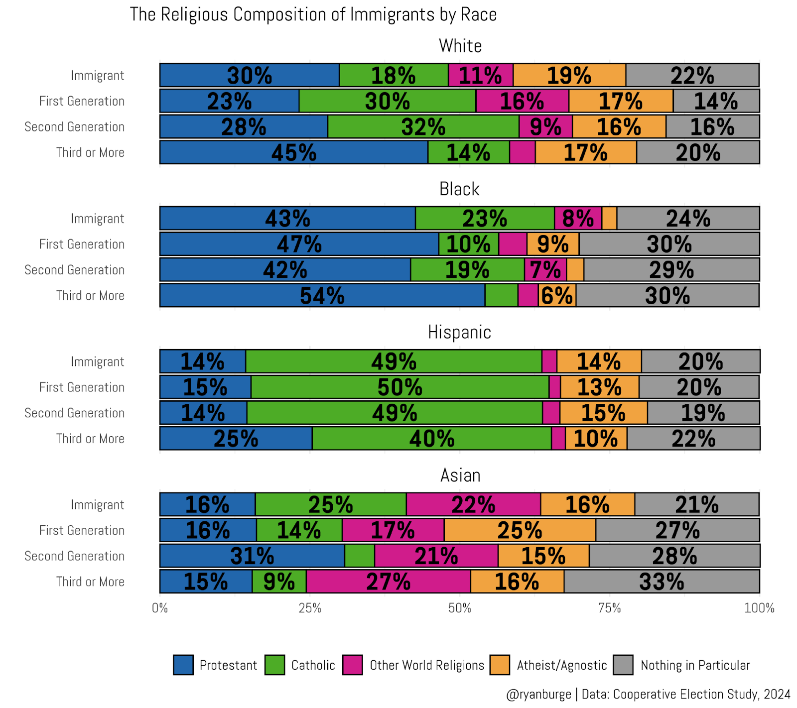 The rest of the racial groups have a few data nuggets here and there. For instance, among Black immigrants, just 26% are non-religious. For African-Americans who can trace their lineage back for multiple generations in the United States, it’s 36% nones. But for Hispanics, there’s basically no change in the nones at all across each type of immigrant. The only thing that jumps out for me is that Hispanics who have multiple generations in the United States are about ten points more likely to be Protestants and ten points less likely to be Catholics.