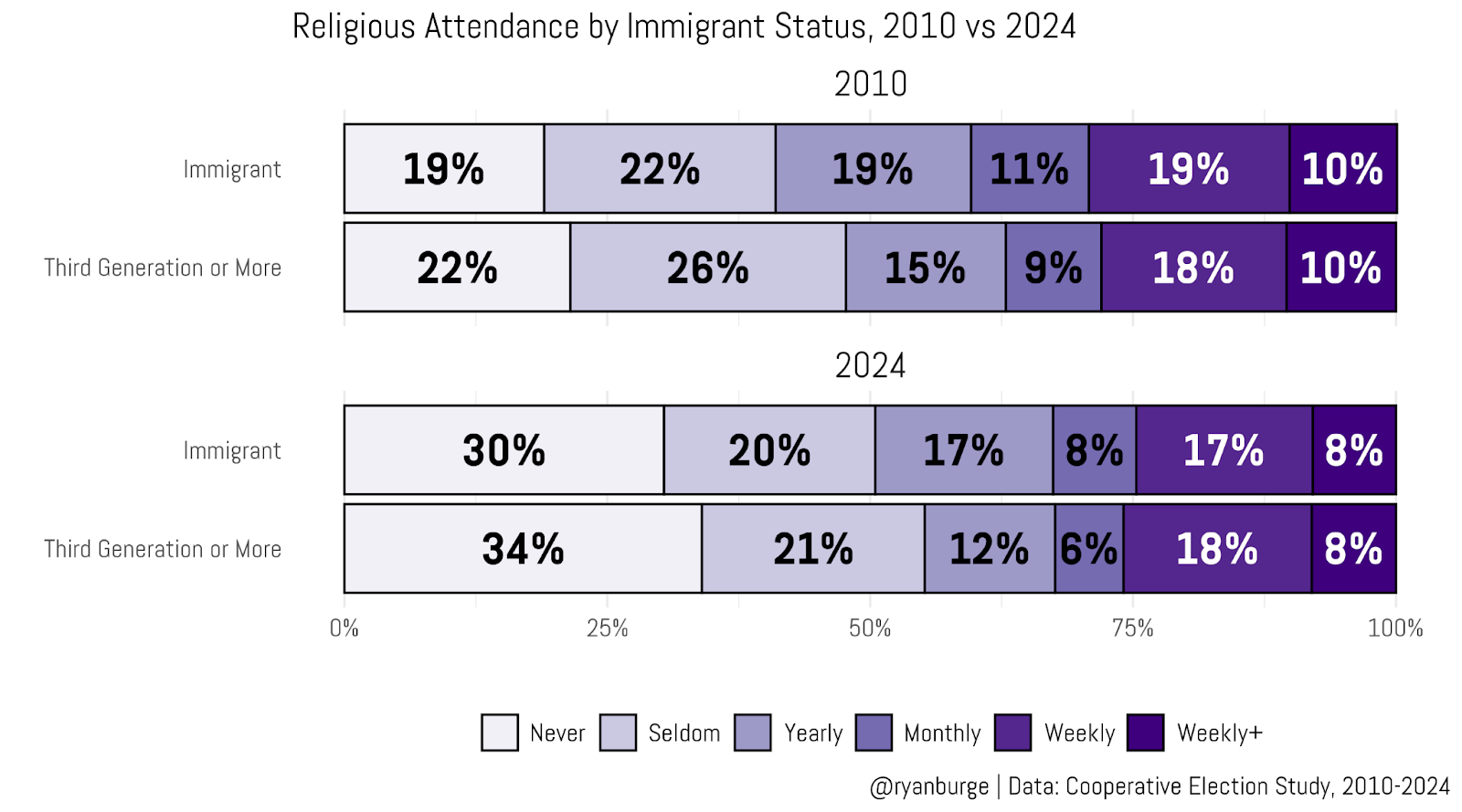 There are some small differences in attendance patterns to be seen. For instance, in 2010, 41% of immigrants said that they attended a house of worship less than once a year. It was 48% of the “third generation” crowd. At the same time, though, weekly attendance rates were almost identical: 29% vs 28%. So those immigrants were more likely to go a couple of times a year, but the gap isn’t huge.