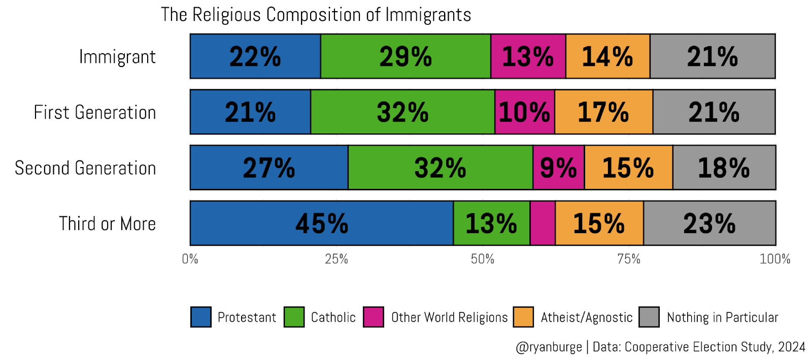 So, are immigrants to the United States more religious than people who have been here for multiple generations? Not really. Among folks who said that they came to the United States themselves, 51% identify as Protestant or Catholic and 35% say that they have no religious affiliation. The remaining 13% are distributed across a whole bunch of smaller religious groups: Jews, Hindus, Muslims, etc. The religious composition of children of immigrants looks almost exactly the same as people who immigrated themselves.