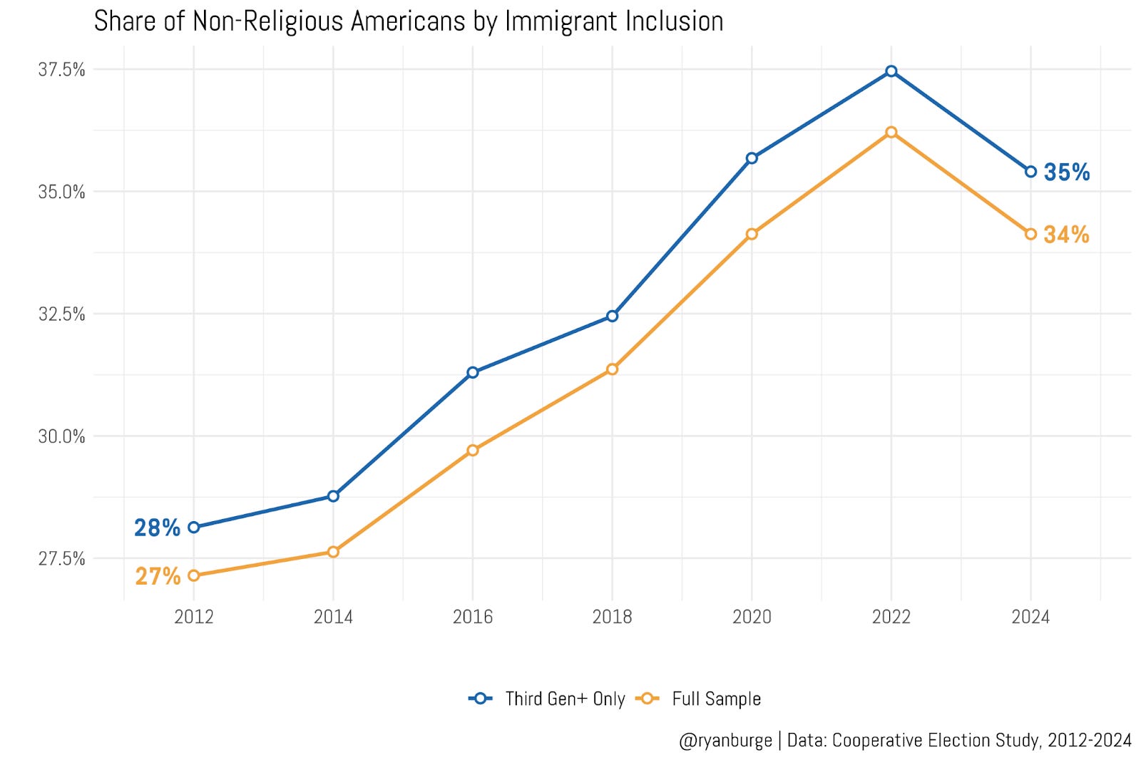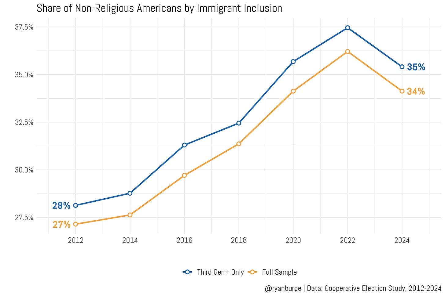 And guess what I found? The differences are just not substantively significant in any meaningful way. In every single year of the survey going back to 2012, the difference is just a single percentage point. In 2012, the full sample was 27% non-religious. If I just looked at people who had been here for a very long time, it was 28%. In 2024, the two numbers were 35% and 34%. Notice how both lines rise and fall in near parallel? That’s even after tens of millions of immigrants have landed on American shores in the last 12 years.