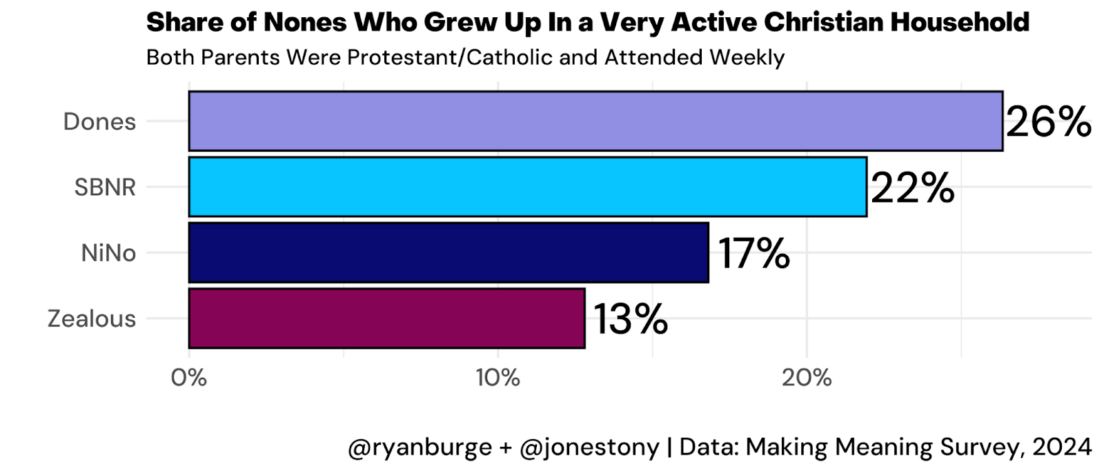 So think about that for a second. The prototypical Done is a Boomer who has almost nothing to do with religion right now. But they were also raised in a household that was very loosely tied to born-again Christianity as well. That’s definitely not what I would have guessed when we started this research project. I would have assumed the opposite: that older nones grew up in deeply devout homes and then spent their adult years trying to rid themselves of any religious attachment.