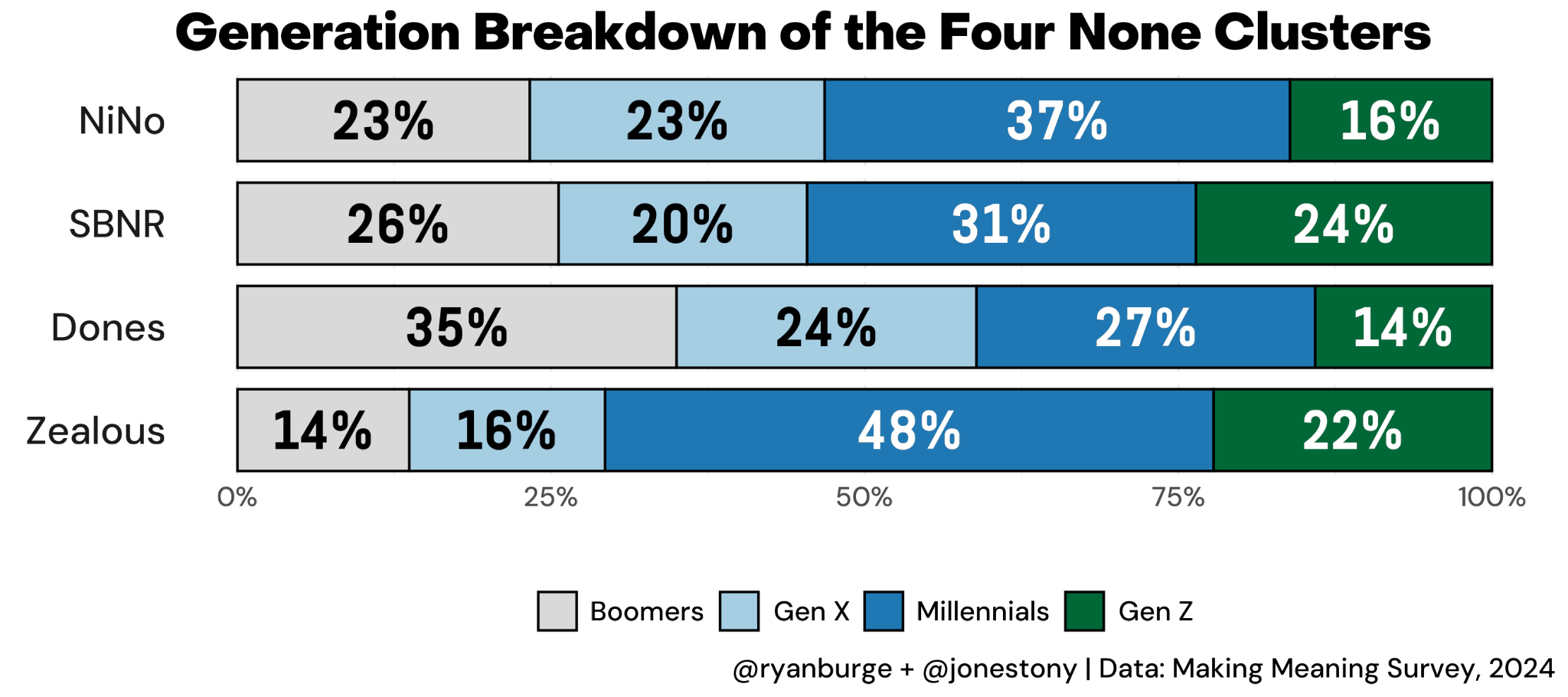 But then compare the Zealous Atheists here to the earlier graph. Only 13% of ZAs said that they were raised in very active Christian households, compared to 7% who grew up in an environment that was deeply evangelical. You know why? Because this is the youngest cluster of the four. Only 14% of this group are Boomers, compared to 35% of the Dones.