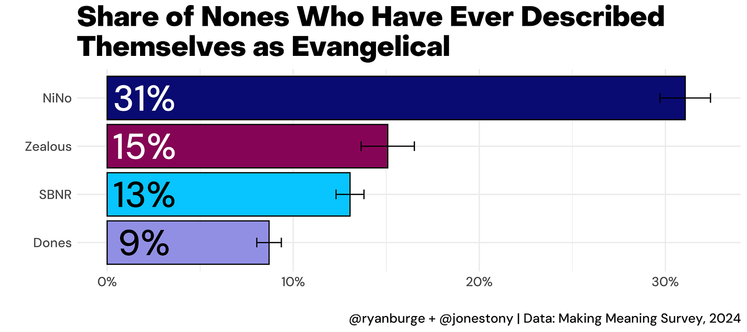 But when I break that down by the four clusters, what you find is that a whole bunch of NiNos would have identified as evangelical at one point in their lives (almost one-third, in fact). Here’s another wild fact about the NiNos: 20% of them said that they were currently evangelical. Which is even stronger evidence of a point we have been making about the nones for a while now—the current survey approach of asking about religious affiliation is not working. There is a small but significant share of folks who say that they are non-religious but then look a whole lot like religious people on other metrics. It’s a real problem.