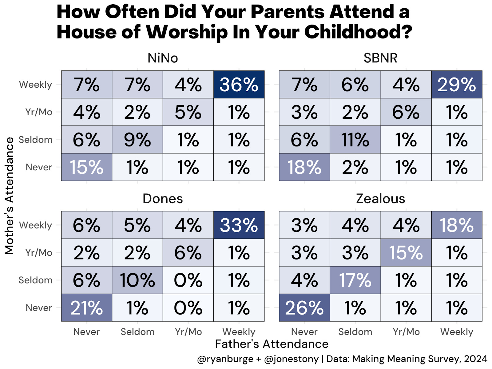 In some ways, this comports with what we’ve already discussed. For instance, the cluster that was most apt to grow up in an environment where both parents were religiously active were the NiNos. Again, that tracks with our understanding of this group—they are still very close to religion as adults. That’s a finding that shows up over and over again across multiple data sources: religious adults grew up in religious households.