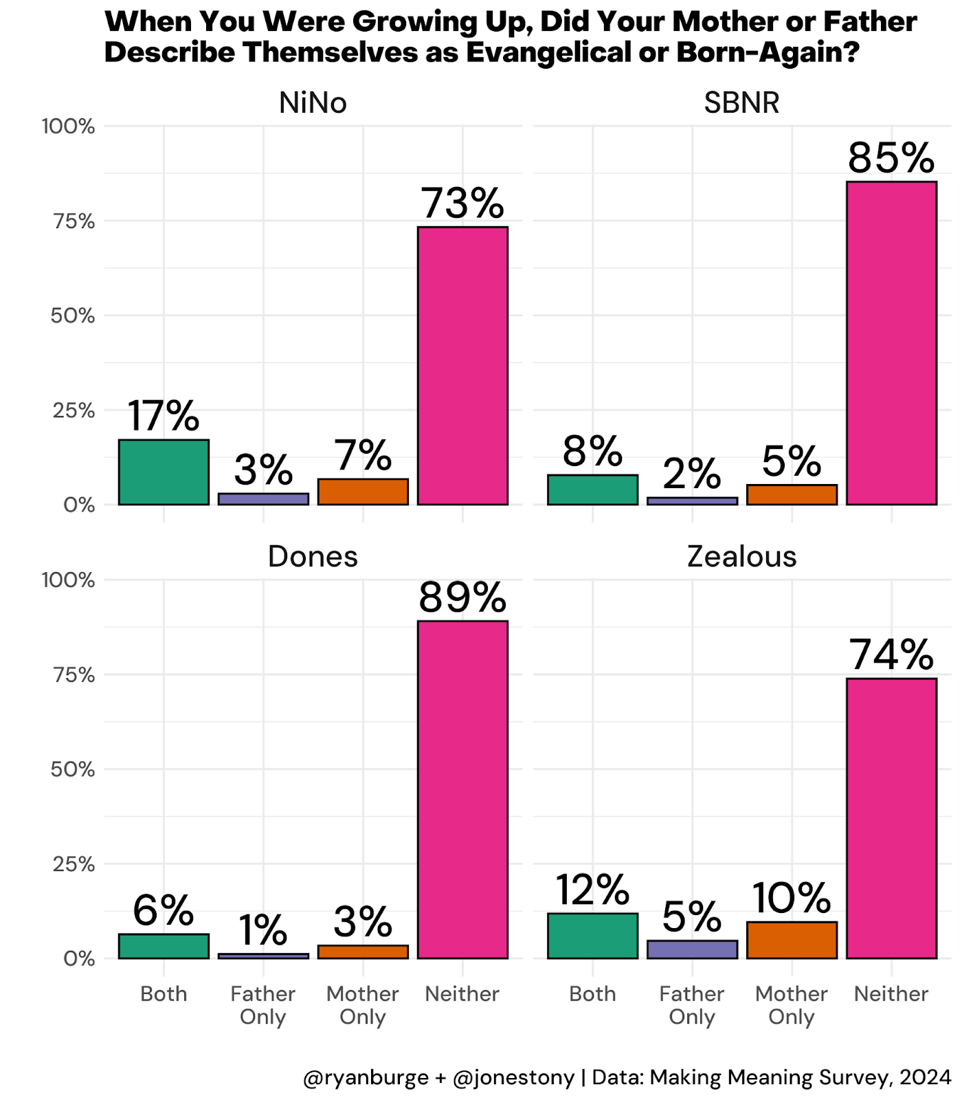 Given what I described in the first graph, this result pretty much tracks with what we would expect. The NiNos were easily the most likely to have grown up in a deeply evangelical household. About 17% of them said that both parents were evangelicals. The group that was next in line were the Zealous Atheists, with 12% saying that both their mom and their dad were born-again. This aligns perfectly with the order in the first graph, and the conclusion is clear: people who grew up with evangelical parents were more likely to identify as evangelical at some point in their lives. Your childhood religious environment matters a whole lot.