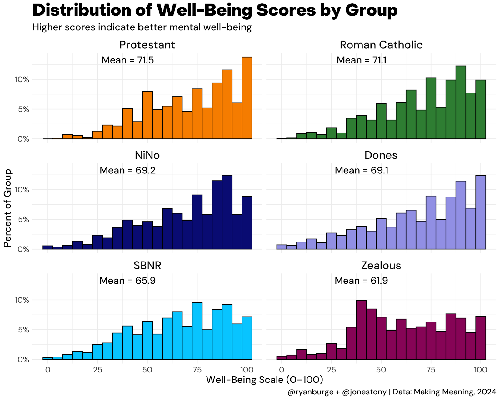 But then notice how close both NiNos and the Dones are to the Christians in the top row. The mean score for NiNos was 69.2 and the Dones were right behind at 69.1. Those are essentially the same score. But they are also only 2 points lower than the Christians. Just ruminate on that a little bit — a Done scores 69/100 on well-being. A Protestant scores at 71.5. That certainly will come as a surprise to many.