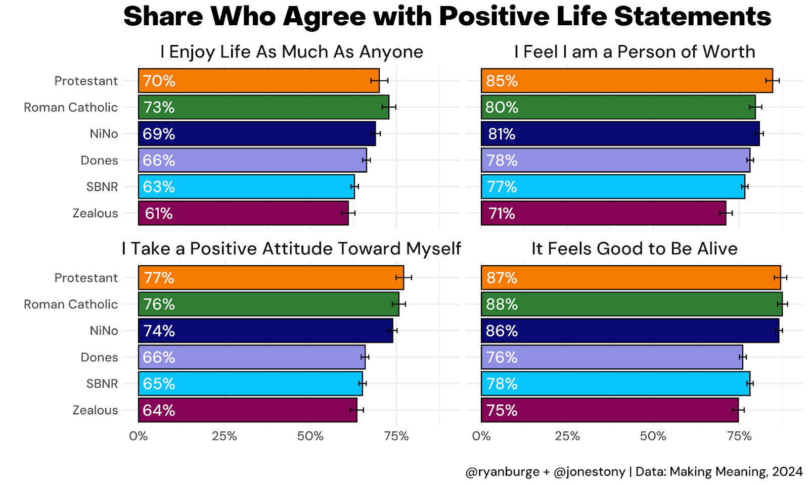 Meanwhile, the group that is the furthest from traditional religion and spirituality (the Dones) don’t seem to be doing demonstrably worse on these metrics compared to Christian groups. They do score lower on some of these questions, but the numerical gap is actually quite small.