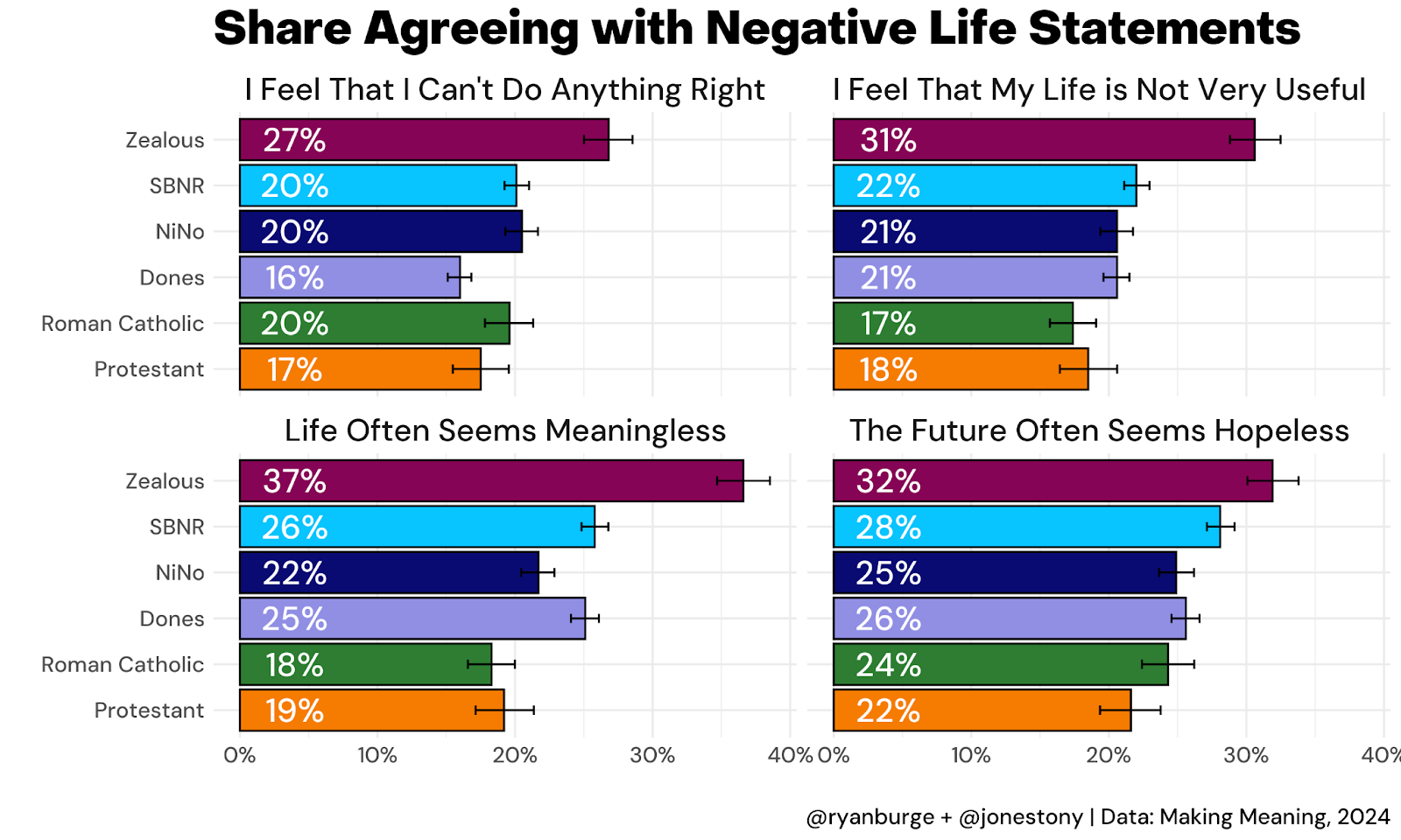 But beyond the overall finding that Zealous Atheists are really struggling compared to the rest of the sample, I don’t look over these numbers and come away with the impression that the other types of nones are really having a hard time with feelings of uselessness and pessimism. About a quarter of NiNos, Dones, and SBNRs say that the future is hopeless. Among Catholics and Protestants, it’s about 2-3 points less.
