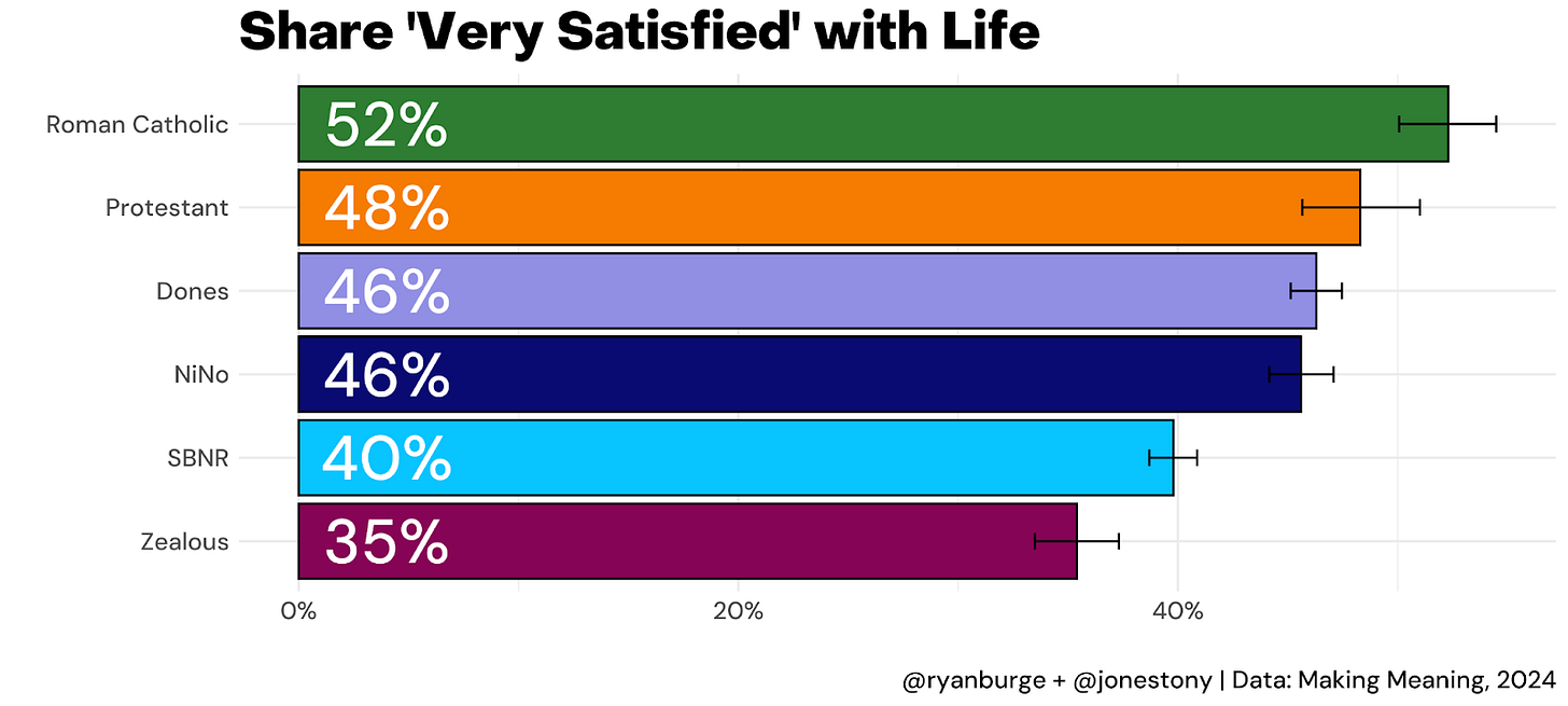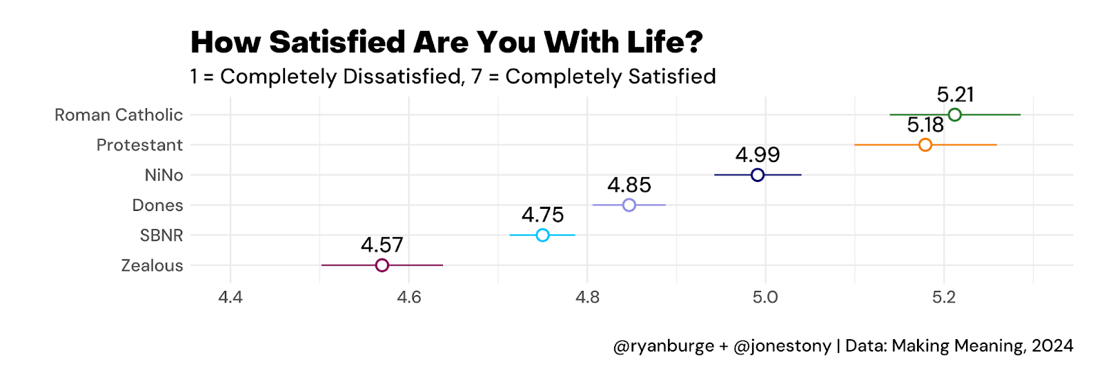 Here, the overall impression is a bit different than the prior calculation. We see that about half of Christians express a great deal of satisfaction with the state of their lives. But then look at where the Dones end up in the graph compared to the prior one. When calculating mean scores of satisfaction, they were clearly behind Roman Catholics, Protestants and the NiNos. That’s not true in this case, though. Now they are neck-and-neck with the NiNos. In fact, they are also statistically tied with the Protestants.