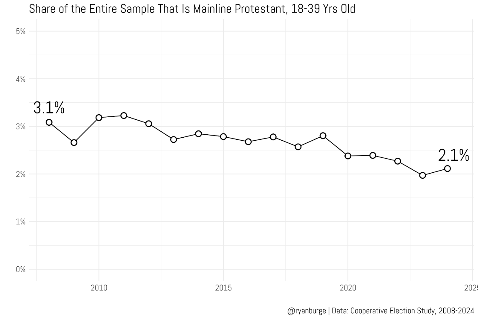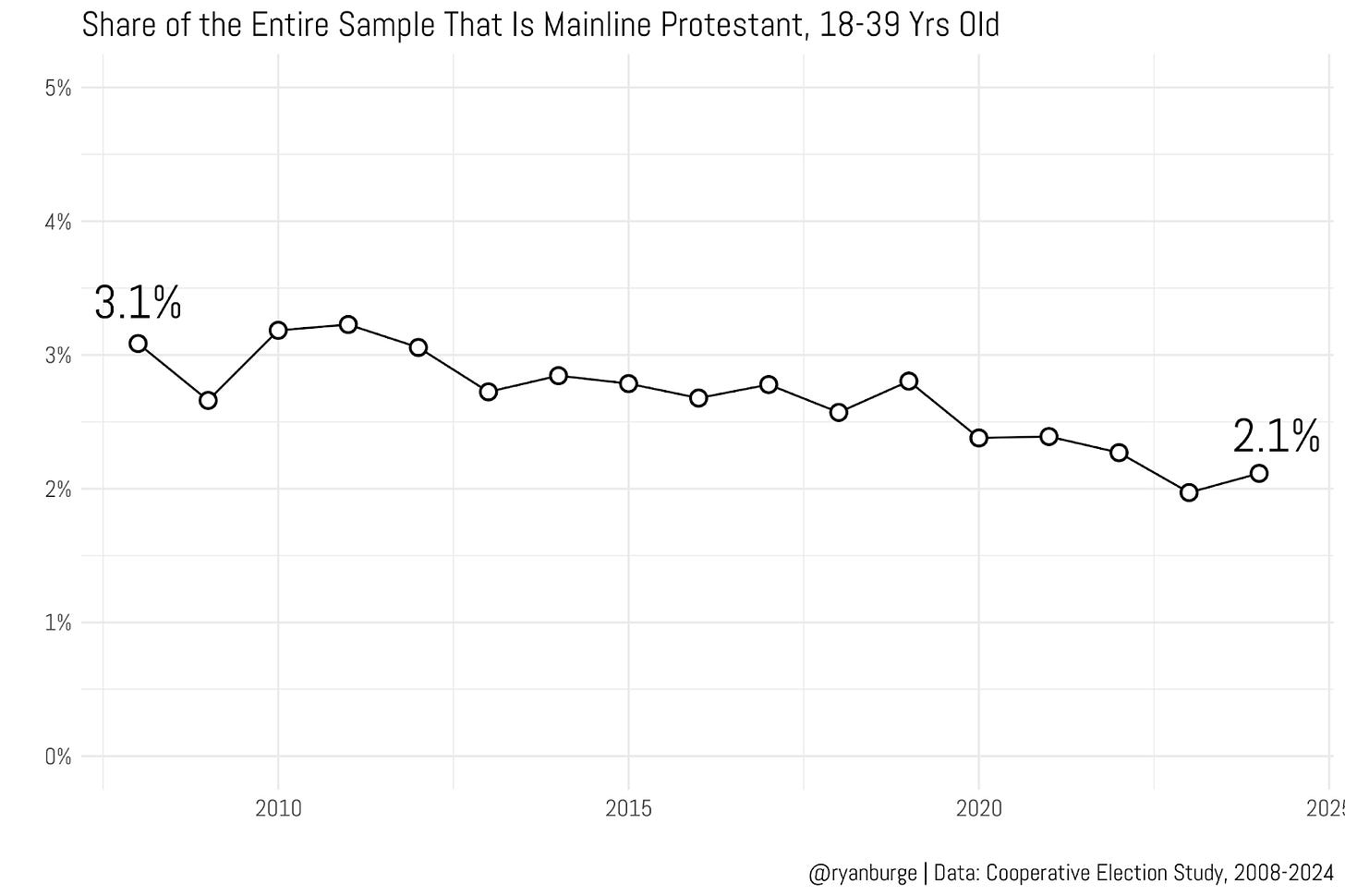 I was pretty pleased to see that the estimates from the GSS and the CES are pretty darn similar when making this calculation. In 2008, about 3% of the entire adult population were younger mainline Protestants. That number held relatively steady for the next decade or so. It was 2.9% in 2019, for instance. But in the last couple of years it’s dropped noticeably. In 2023, it was right at 2% and in the most recent data it was 2.1%.