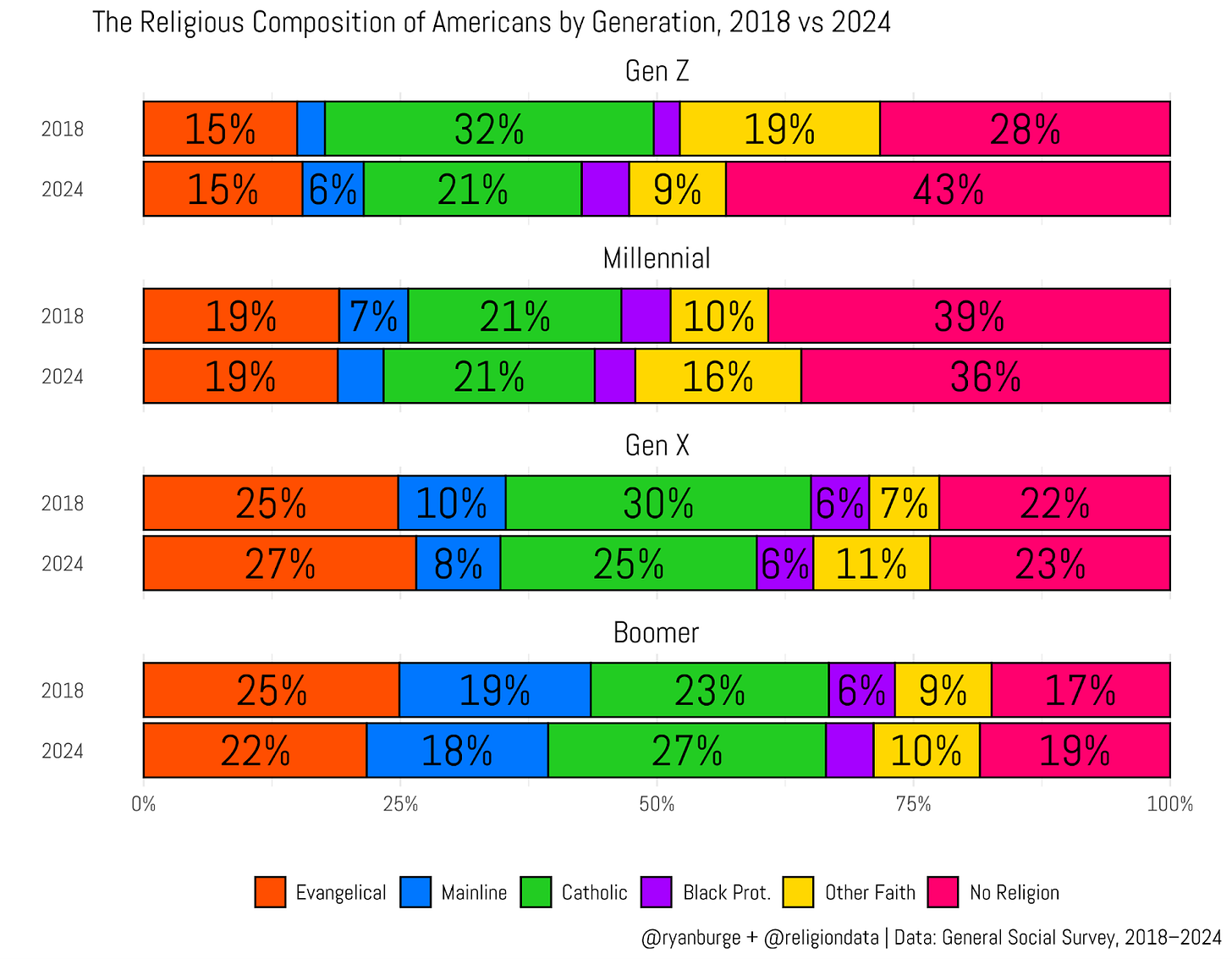 What I’m seeing here is quite a bit of wiggle but not really any discernible trends. For instance, the share of young adults who were evangelical in 2018 was 14.8%. It was 15% in 2024. The share who were nones went from 40.5% to 41.8%. There’s just nothing to write home about there.