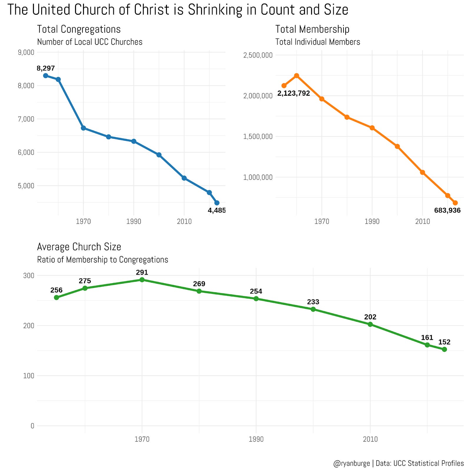 I swear before I get done writing this newsletter, I will have written up a big report on nearly every American Protestant denomination. Just looking through the archive, I think I’ve tackled at least seven of them so far (TEC, ELCA, PCUSA, SBC, AG, PCA, UMC). Some are just “one-offs,” but a couple of those denominations have enough good annual data that it’s possible to analyze their trends every year. It’s time for me to add another one to the list—the United Church of Christ.
