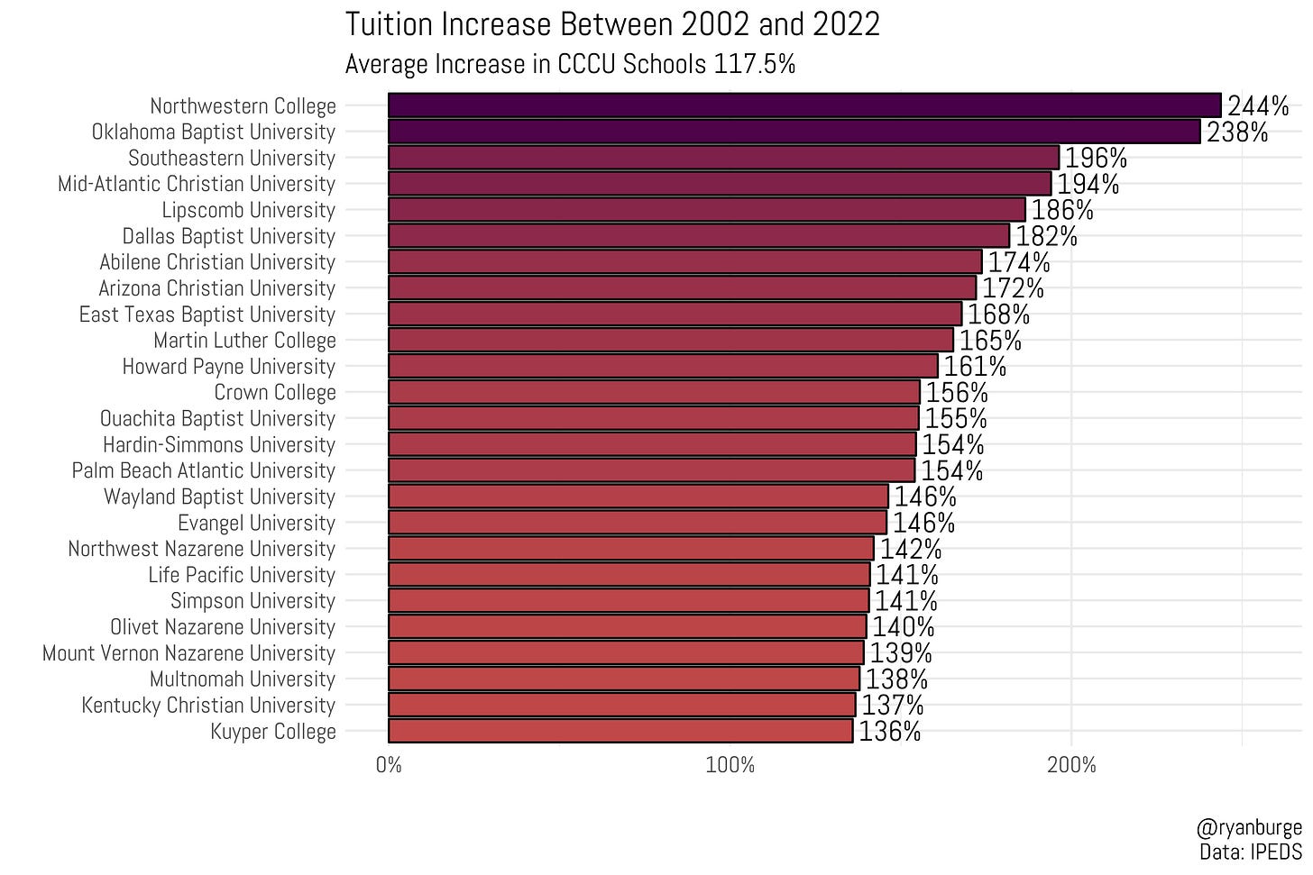 Let’s start with the increase in tuition price between 2002 and 2022 (that’s the biggest spread I could find on IPEDS). This includes the cost for students who are in-state and are living on campus. So, the most classical sense of the cost of higher education. The average increase in this cost across all the schools in the CCCU was 117.5%. As a comparison, U.S. News and World Report says that since 2004 the cost of tuition/fees has risen 132% at private universities and 158% at public universities. So, CCCU schools are actually holding the line a bit more than other schools.