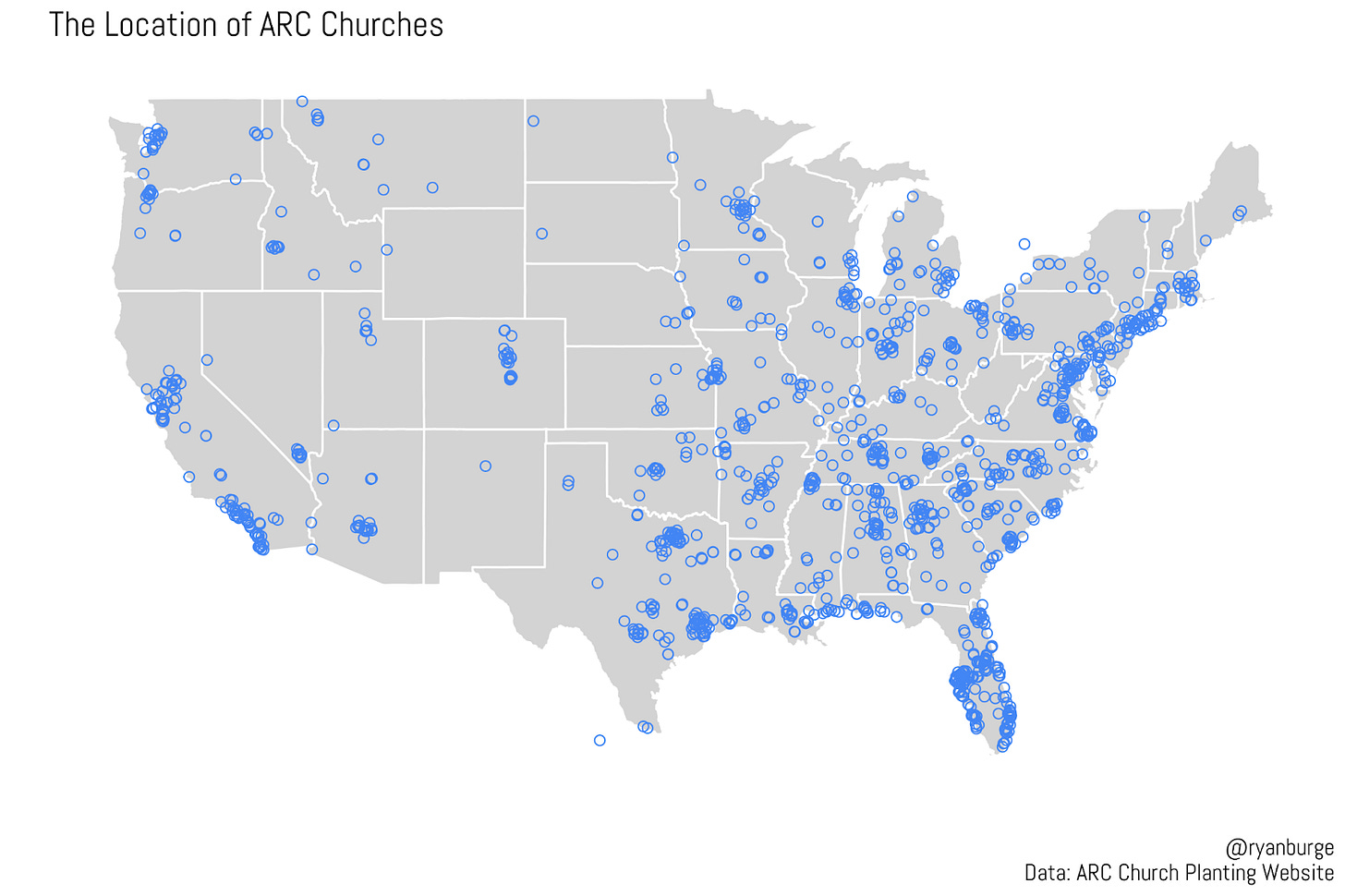 In total, I grabbed information from 1,244 churches in the database (some of them are just ARC-affiliated, not necessarily planted by ARC). This is a trend I’ve written about before but it looks like these church planters decide that God is leading them to establish a house of worship in parts of the country that are densely populated (and often growing rapidly). You can see a whole bunch of dots all over the coast of Florida and California.