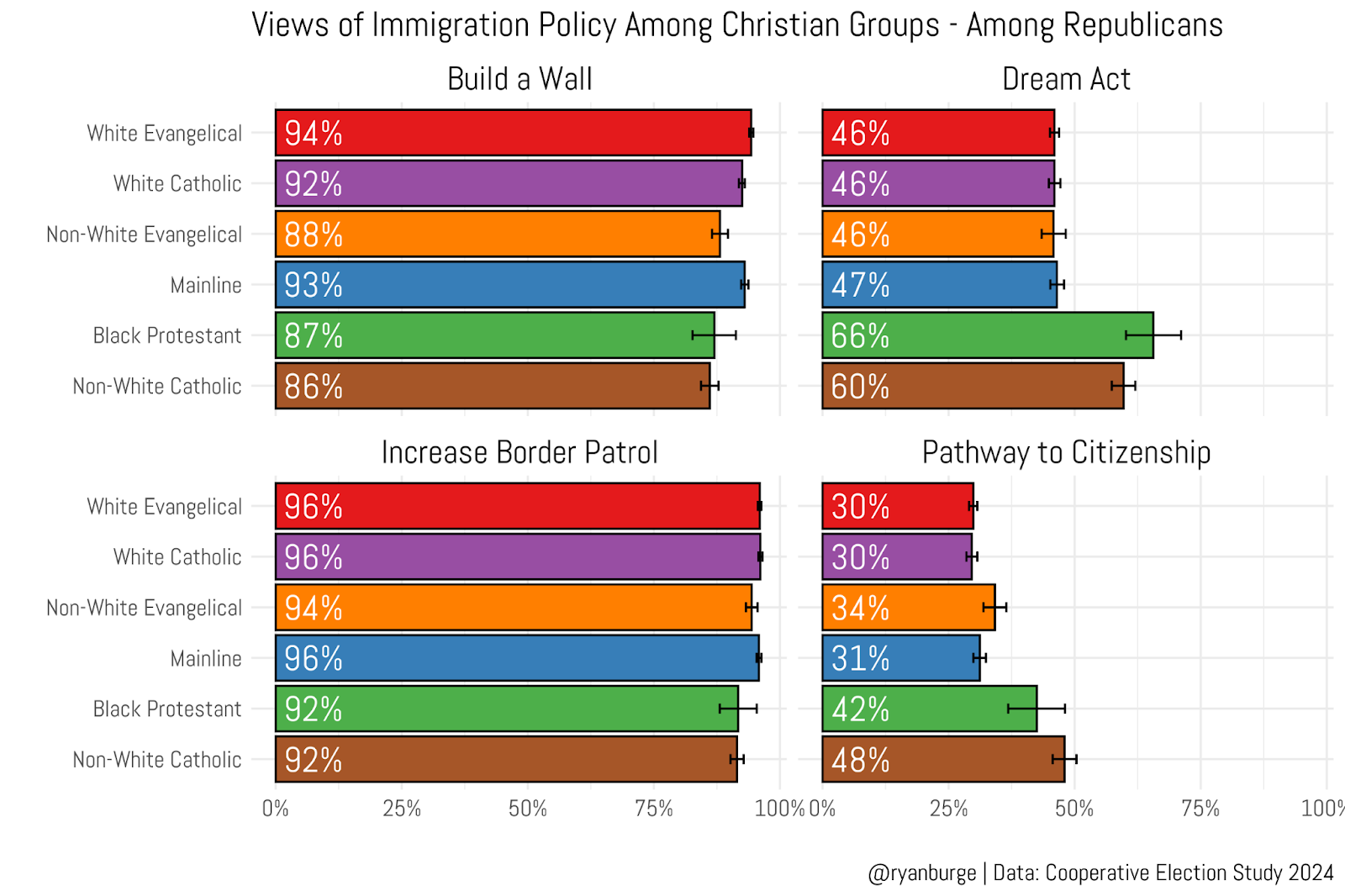In other words, white evangelical Republicans and white Catholic Republicans have essentially identical views on immigration in the United States.