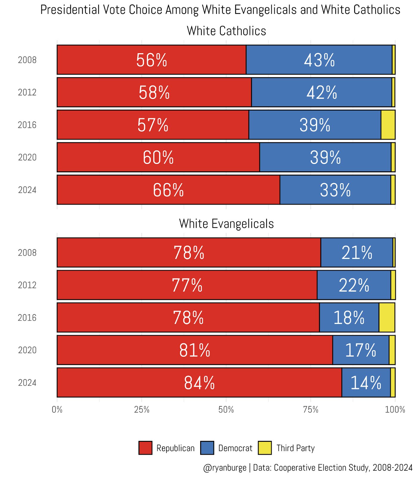 The gap was 19 points in 2012, 21 points in 2016, 21 points again in 2020, and 18 points in 2024. What’s really striking is that both groups also drifted to the right during this period. White Catholics became about ten points more Republican, while white evangelicals moved roughly six points in that direction.
