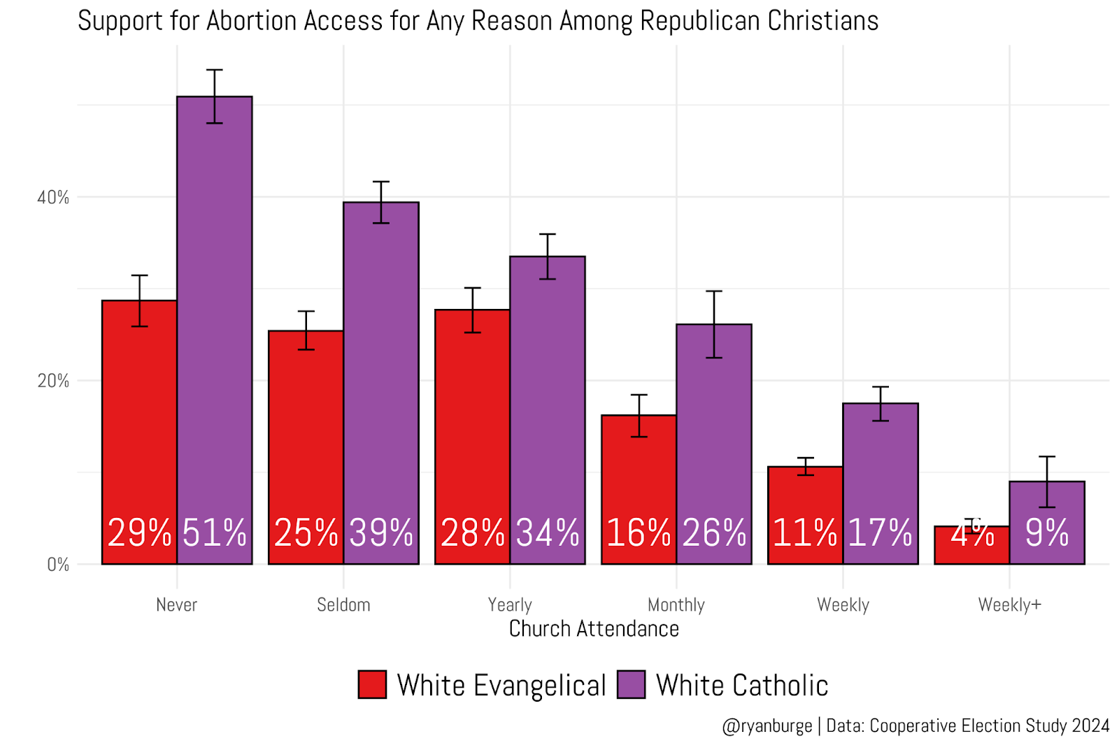 Yes, I think it’s clear that even after controlling for race and partisanship, there’s still a noticeable gap between Catholics and evangelicals on whether a woman should have access to an abortion if she wants one for any reason. Those differences are especially large among the least frequent attenders. Among those who never go to church, a white Catholic Republican is 22 points more supportive of abortion access than a comparable white evangelical. Among seldom attenders, the gap is 14 points.