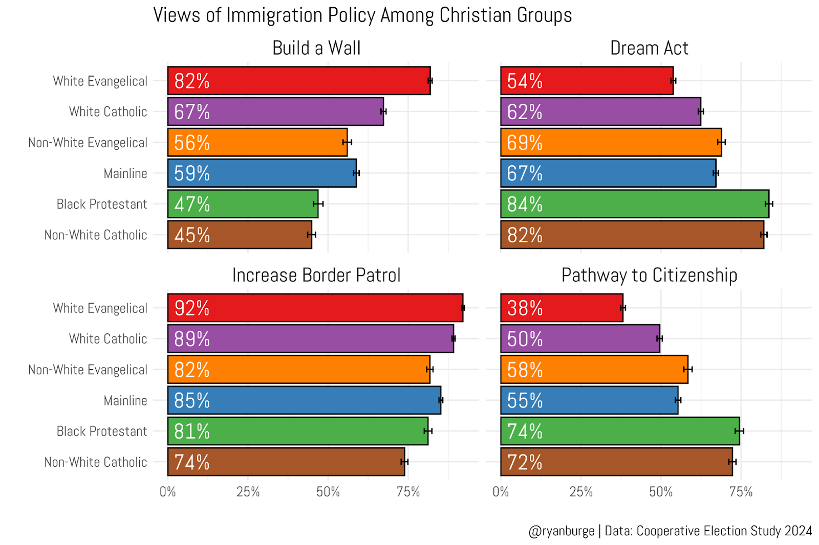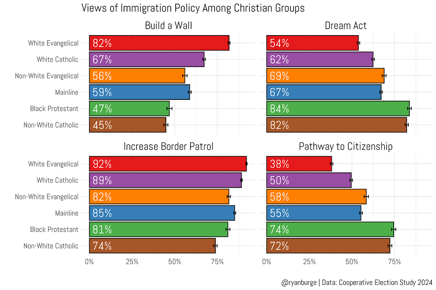 On the Dream Act, support drops for both groups. About 54% of white evangelicals back it, compared to 62% of white Catholics. There are only two Christian groups where a clear majority don’t favor a pathway to citizenship: white evangelicals at 38% and white Catholics at 50%.