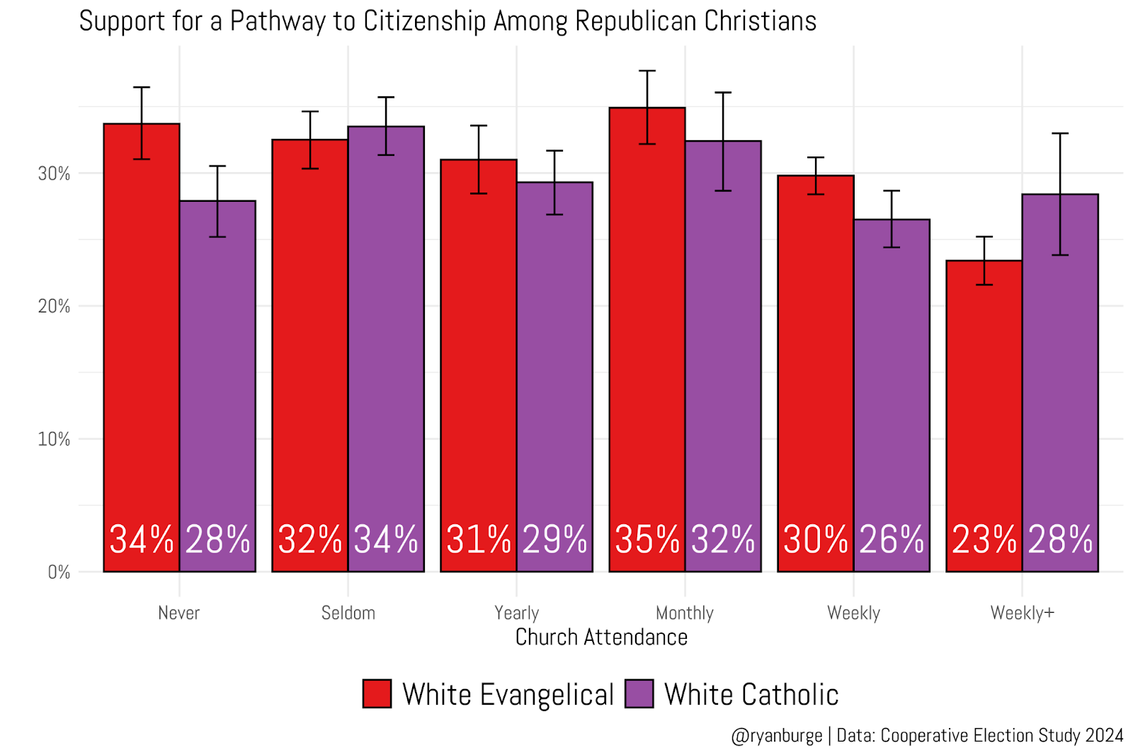 But across every other attendance level, there’s essentially no difference between the two groups. Among those who attend monthly, 35% of white evangelical Republicans favor a pathway to citizenship, compared to 32% of white Catholic Republicans. That difference isn’t statistically or substantively meaningful.