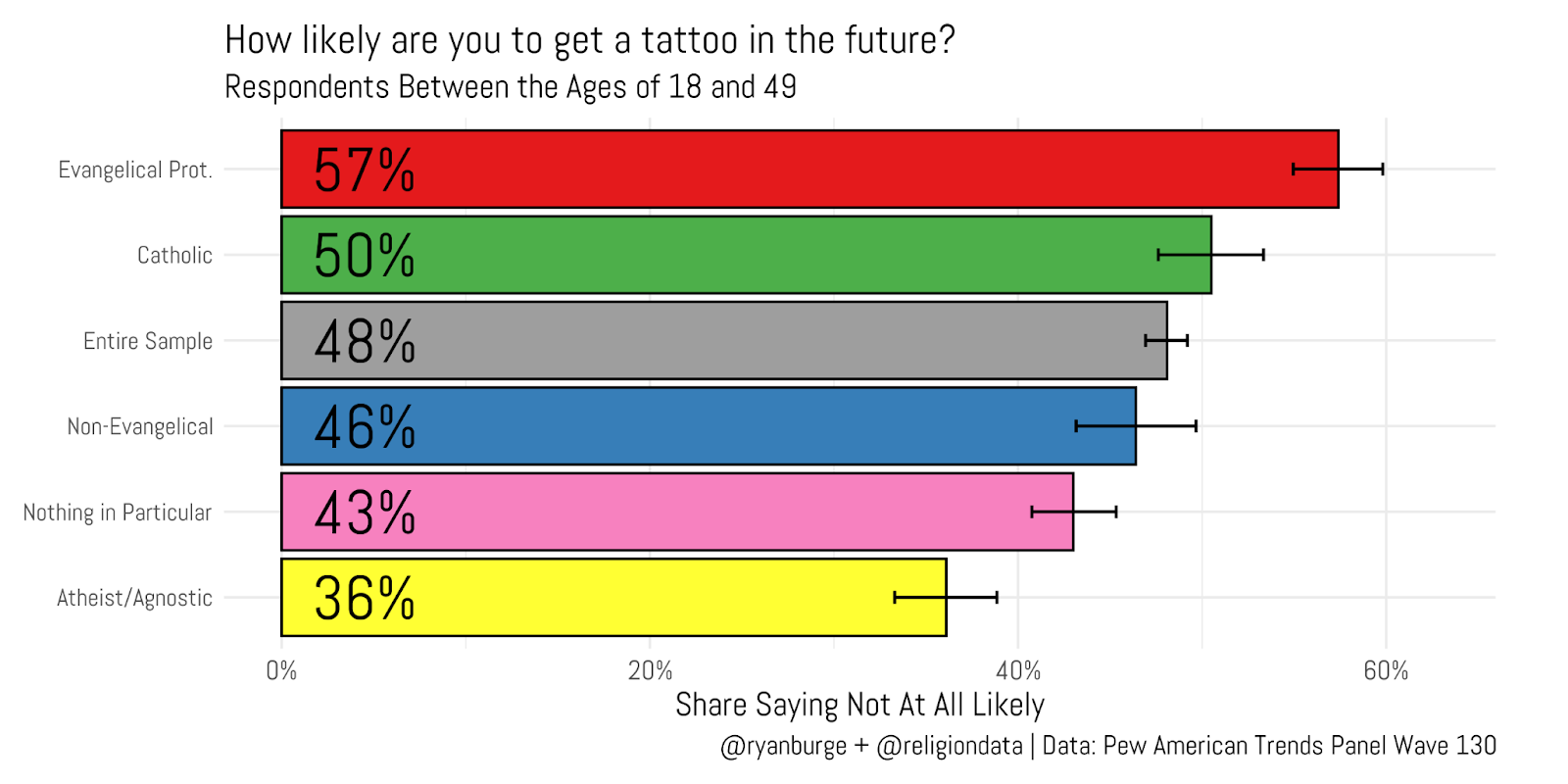 In other words, the data don’t suggest that religious people are disproportionately getting tattoos as a way to make strong statements about their beliefs.