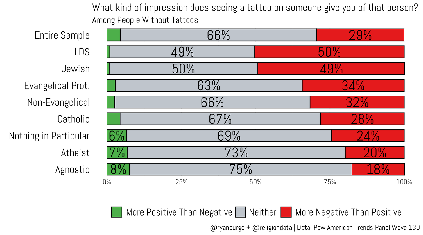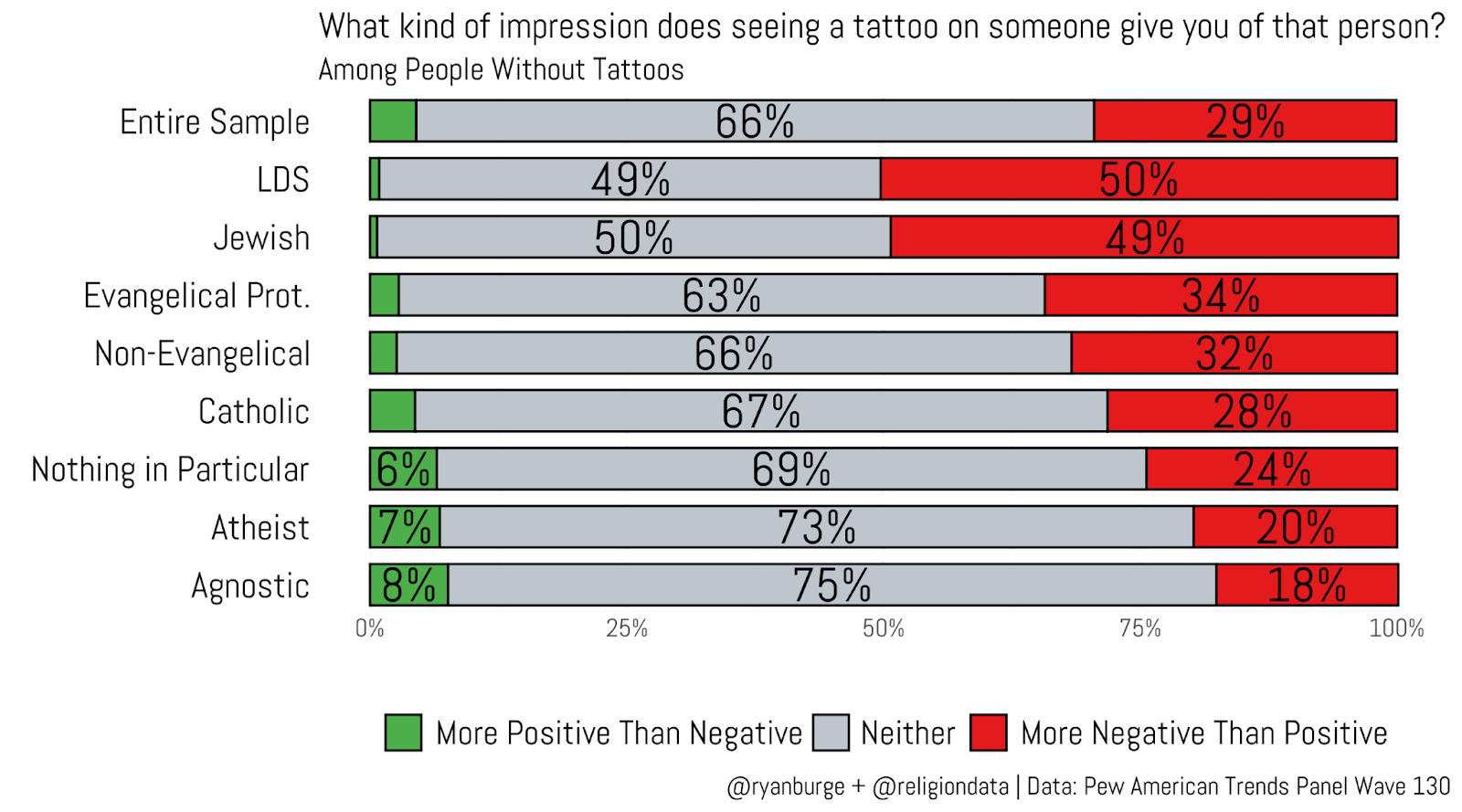 Two groups clearly stood out here—Jews and Latter-day Saints—which has been a recurring theme throughout this post. About half of each group said that seeing a person with tattoos gave them a negative impression, and almost none said it left a positive one.