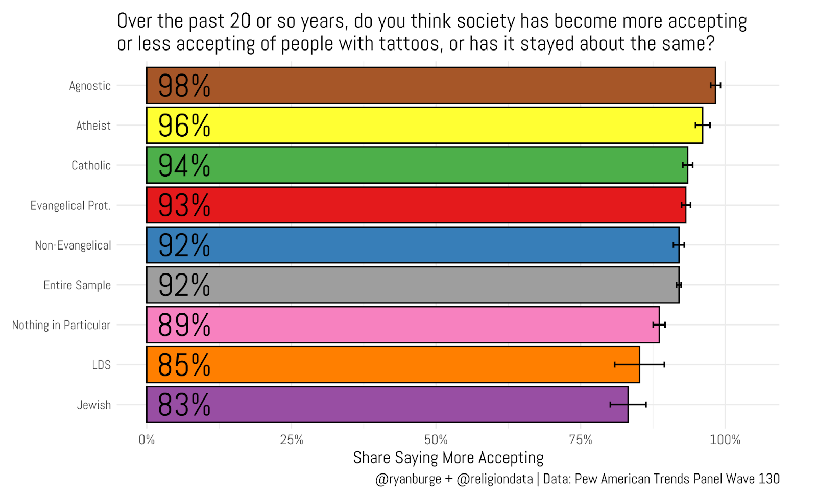 The groups least likely to share that view were Latter-day Saints, at 85%, and Jews, at 83%. But to keep things in perspective, that still represents a clear majority within those traditions who see tattoos as more acceptable today. Among the largest religious groups—like evangelicals and Catholics—the belief that tattoos are now mainstream is almost universal, hovering around 93%.