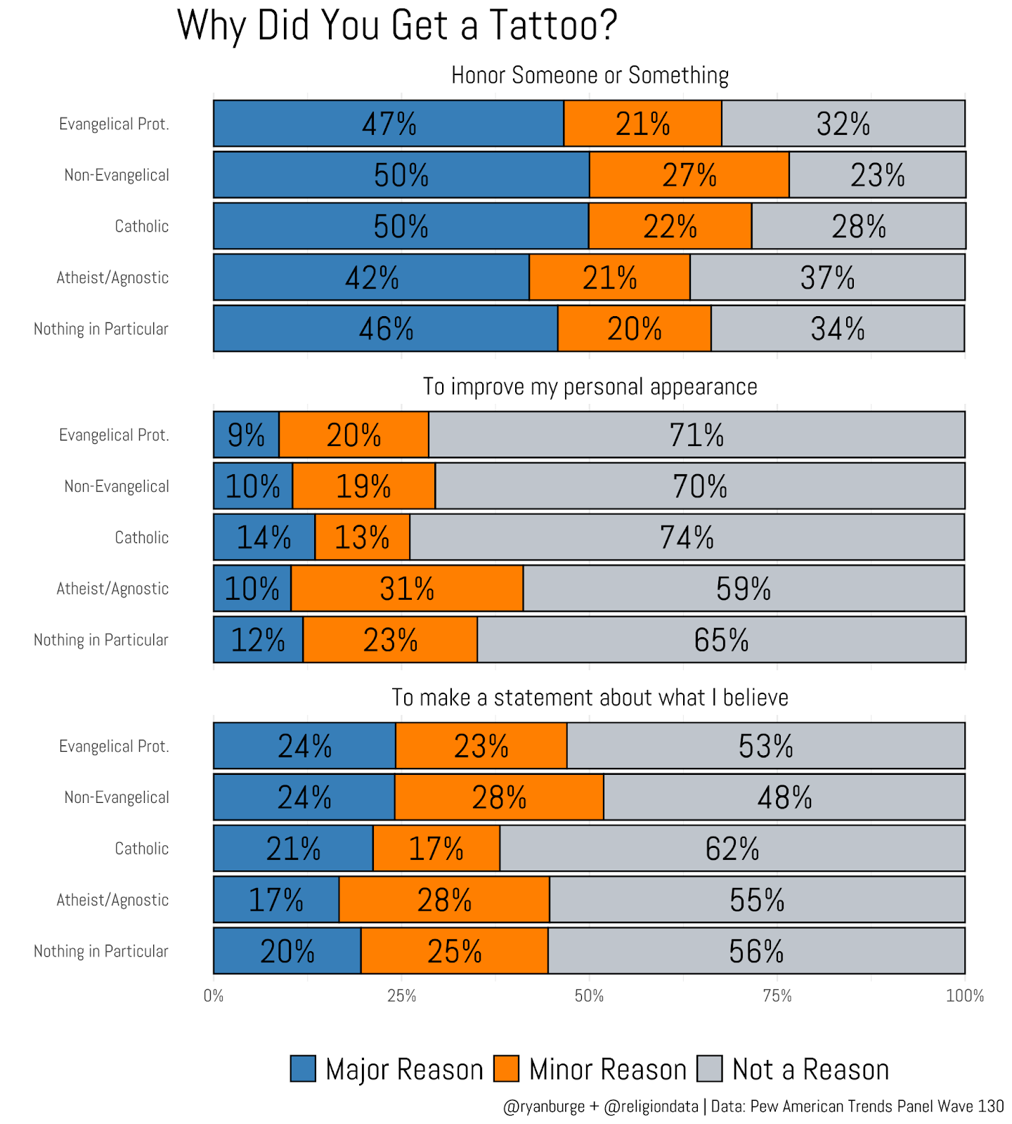 When it comes to pure aesthetics, however, atheists and agnostics lead the way. More than four in ten said they got a tattoo to improve their personal appearance—10 to 15 points higher than any other religious group.