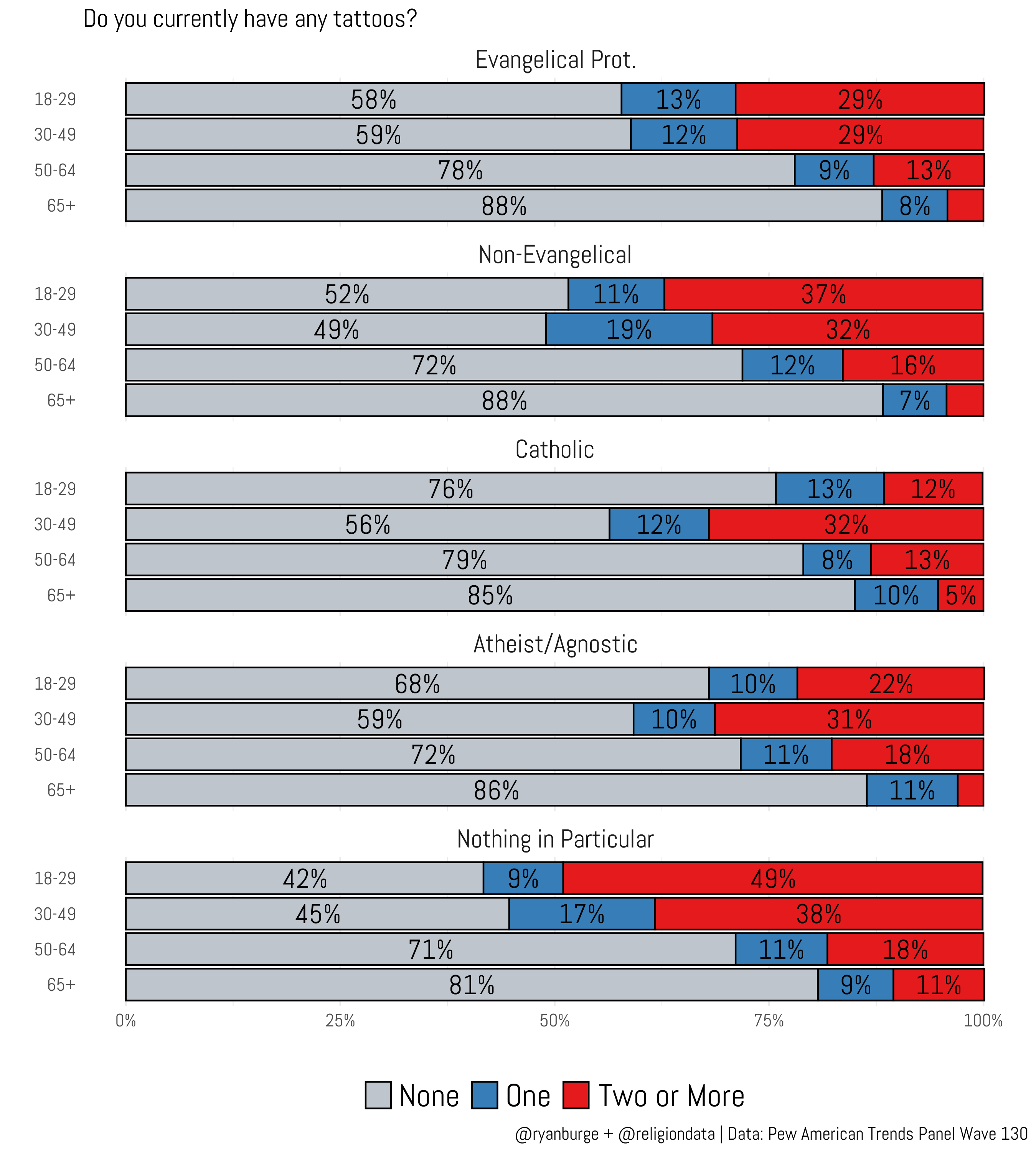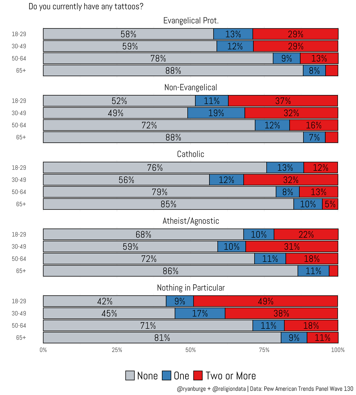 When looking at the oldest adults in the sample, the share with a tattoo was incredibly small and showed little variation across religious traditions. For example, 81% of evangelicals aged 65 or older reported having zero tattoos, which was the same share as the “nothing in particulars.” Among the other three groups I analyzed—non-evangelical Protestants, Catholics, and atheists/agnostics—the figure was at least 85%. Put simply, a young adult today is about 30 percentage points more likely to have a tattoo than a senior citizen.