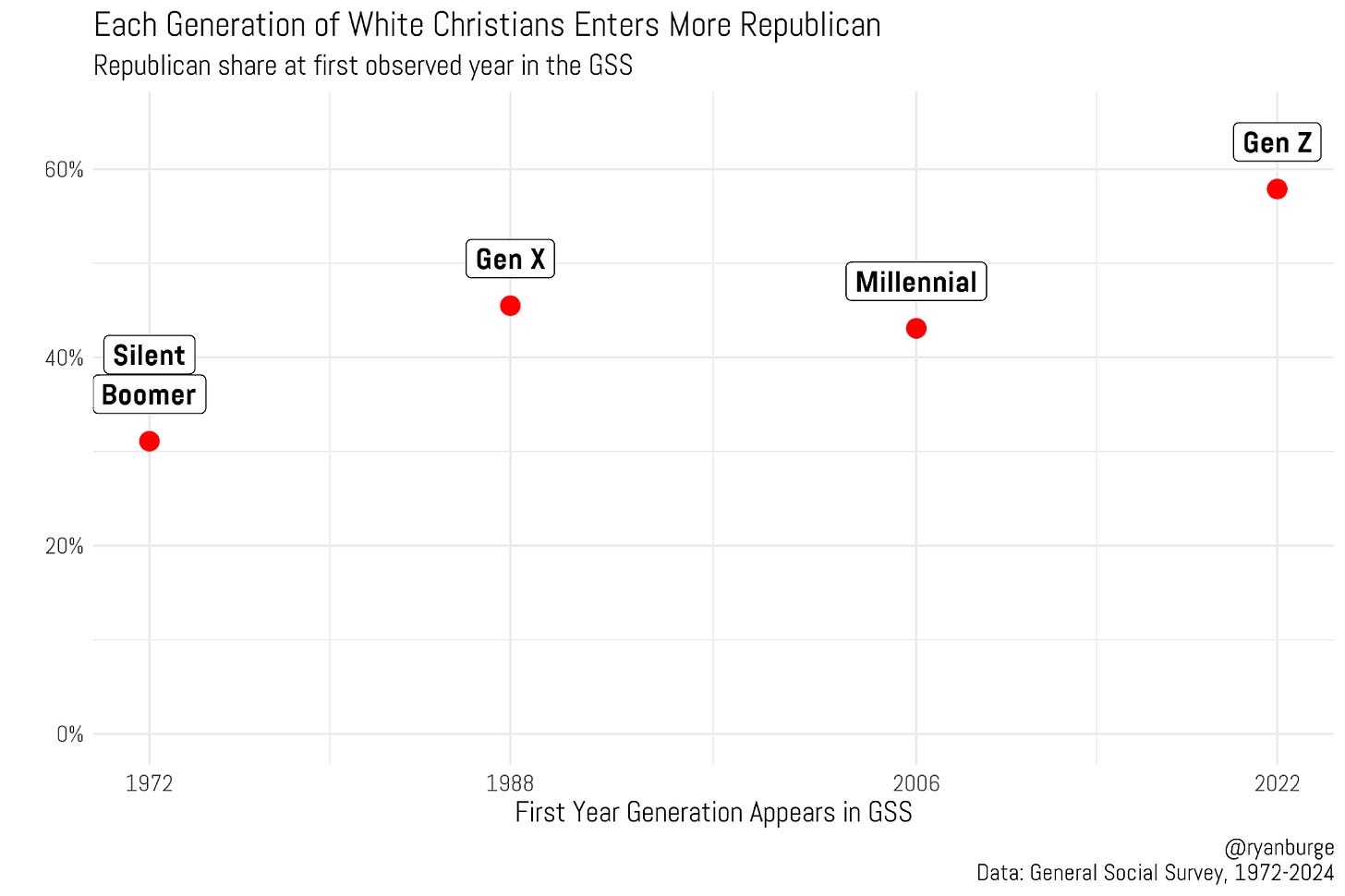 That’s an important point to note, by the way, and something I want to visualize in a simpler way. If you look at the “entry point” for the younger generations of white Christians, you see that they come into adulthood with a much more Republican-leaning outlook than their parents or grandparents.