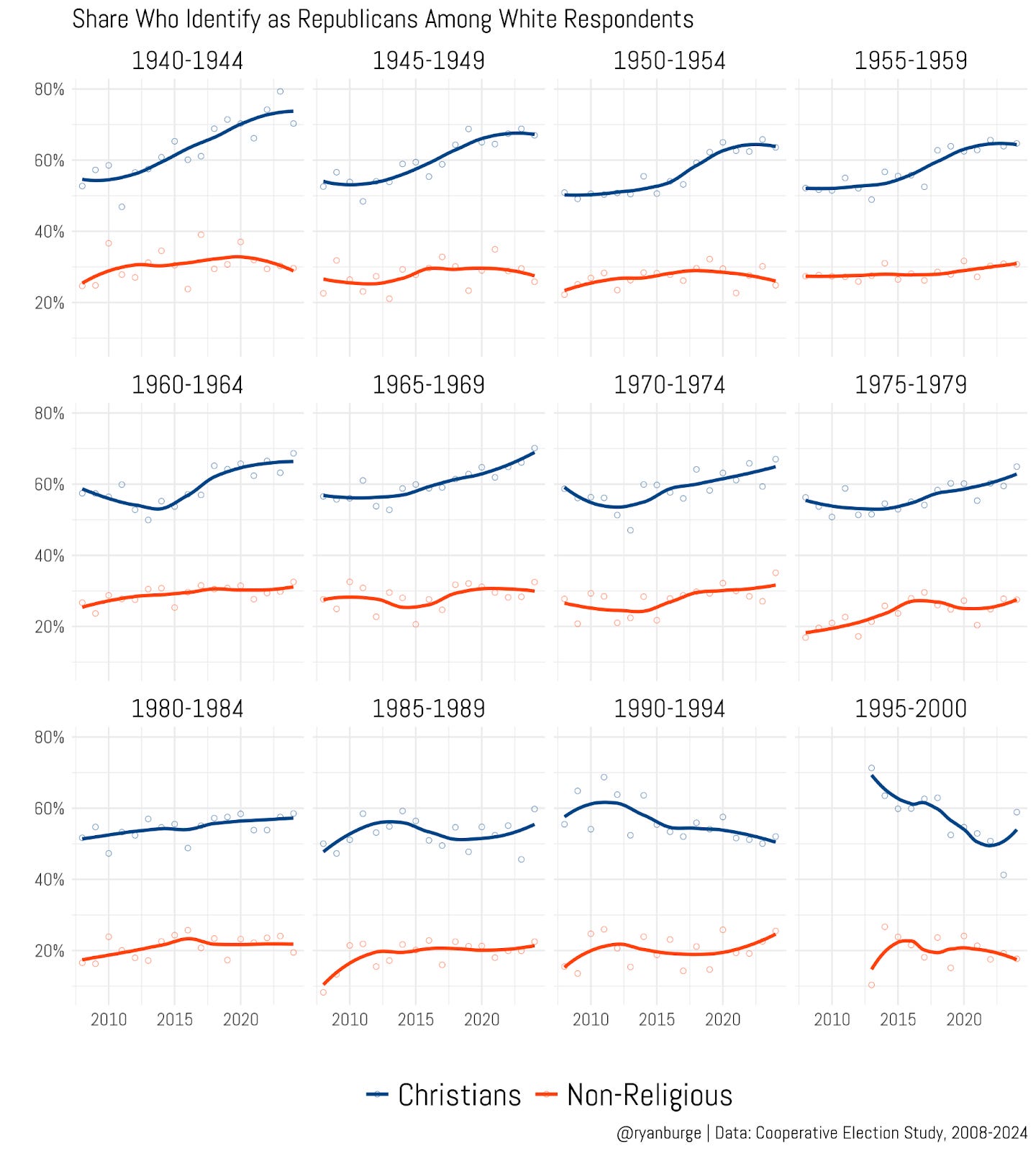 What we are really looking for here is the trajectory of the lines — we want to be able to discern if there are “in-cohort” changes in political partisanship. You can most definitely see that across the top row of graphs when it comes to white Christians. Their movement toward the GOP is sort of stunning to consider given that we are only looking at a timeline that goes back sixteen years. Among folks born in the early 1940s, a bare majority of white Christians were Republican in 2008. By 2024, that figure had risen to about 70%. You can see that the inflection point for many in this cohort is right around the time Donald Trump was first elected to the White House.