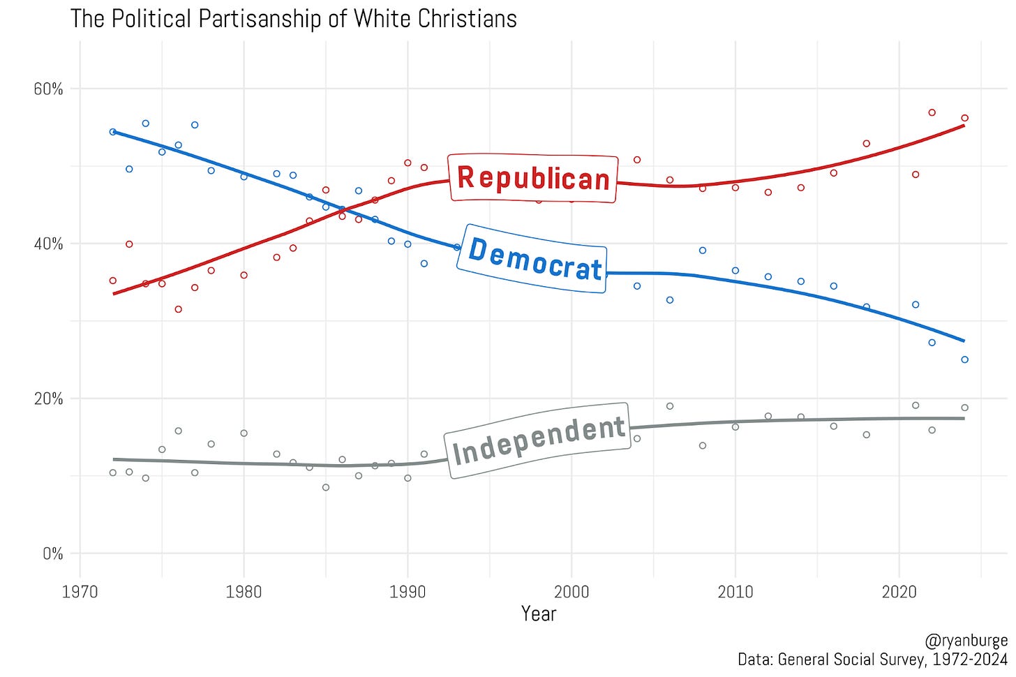This is a story not just about religion — it’s also deeply intertwined with race. The Republican Party’s grip on white America is strengthening, regardless of whether they go to church or not.
