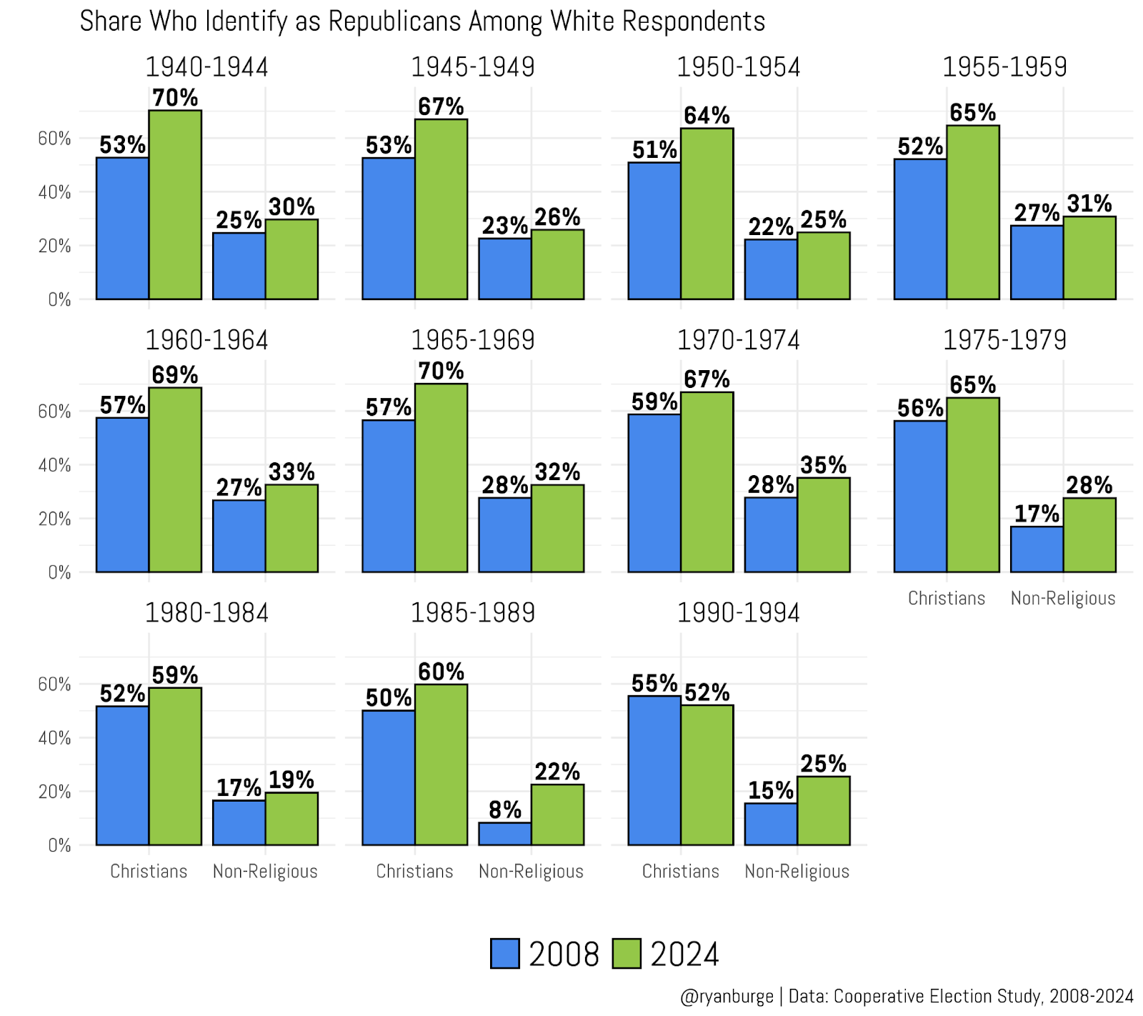 In fact, there is not a single birth cohort in this entire analysis where the nones have not become more Republican between 2008 and 2024. The size of the movement is smaller than it is among Christians, but it’s still there. In many of these cohorts, white non-religious folks are 4–8 percentage points more likely to identify as Republican today compared with 2008.