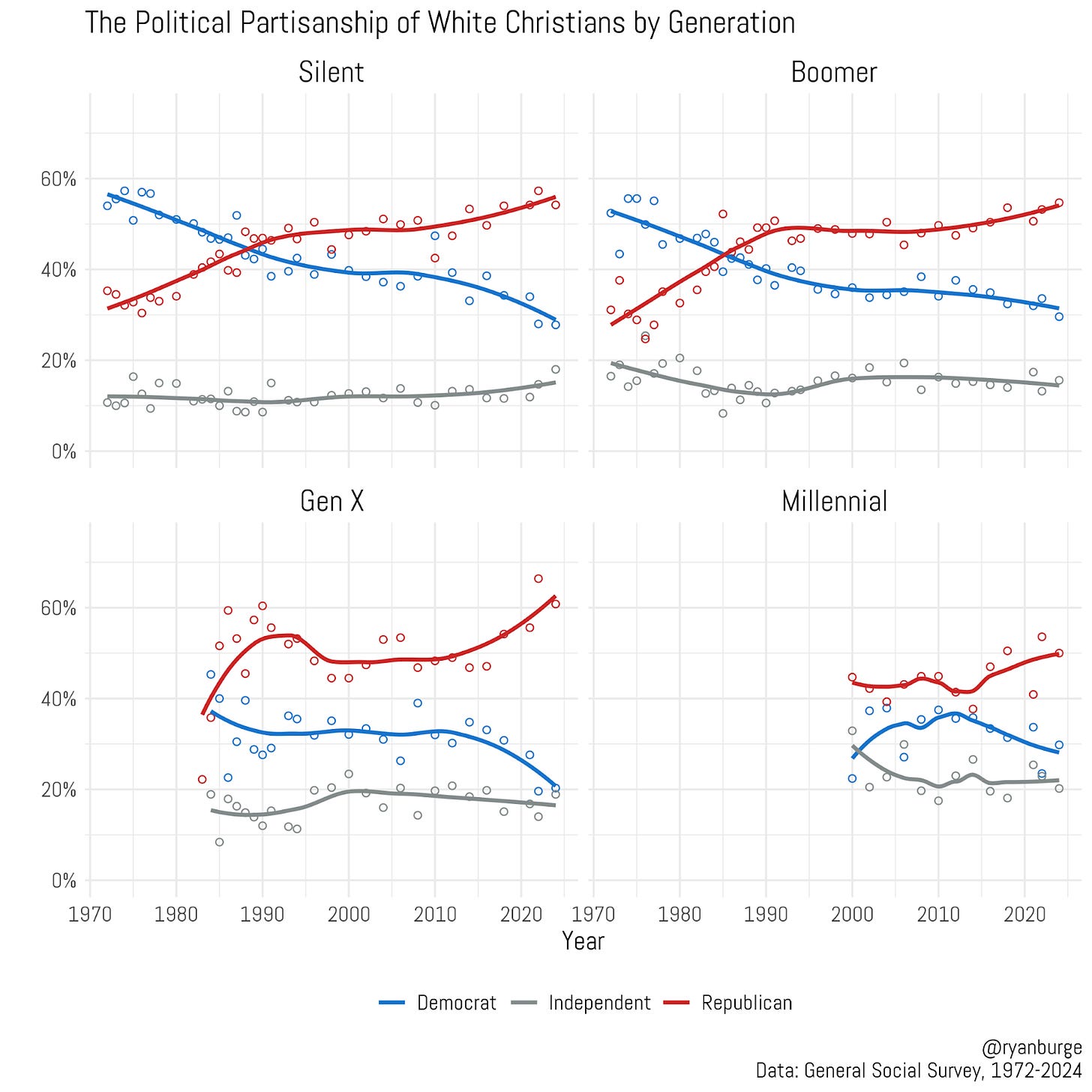 For Gen X and Millennials, we obviously can’t trace their timeline as far back as the older generations. There is no clear “crossover” moment that we can really discern, although you can kind of see it when looking at the mid-1980s for Gen X. However, both generations of white Christians have been plurality (if not majority) Republicans for the last 35 years. It feels like they came of age when the connection between white Christianity and the GOP was already well established, and they just fell in line.
