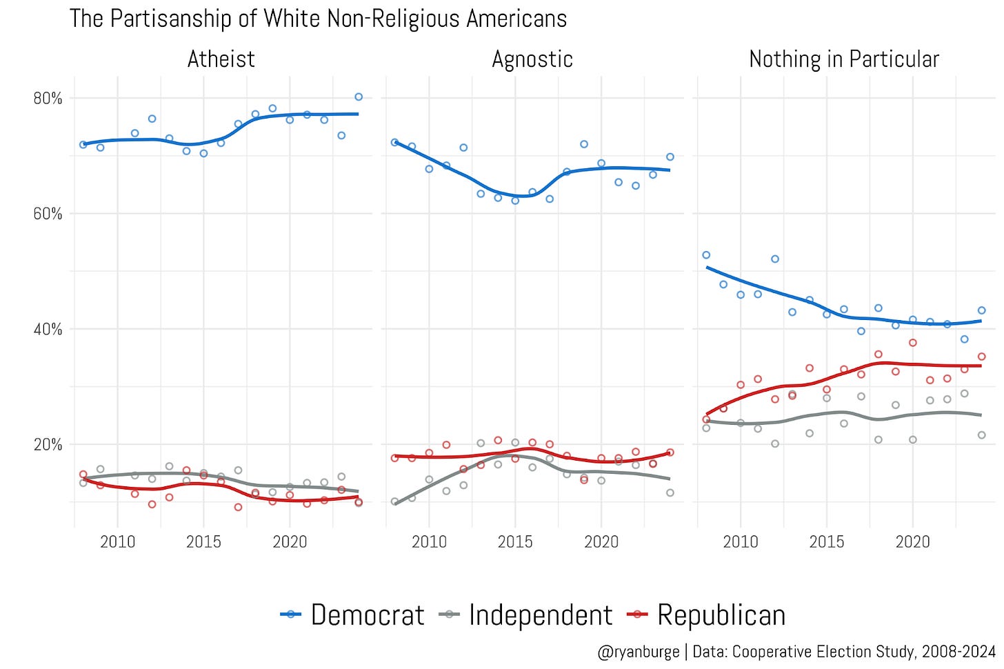 I have intentionally left out a really interesting finding up to this point, though — one you may have picked up on if you carefully looked at the other part of this analysis: folks who claim no religious affiliation. Yes, white Christians have shifted to the right over time. But guess what? So have some white non-religious folks.