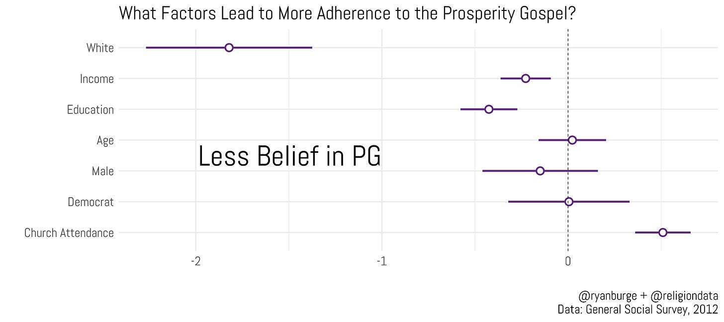 We have a total of one variable that predicts a higher likelihood of embracing the prosperity gospel and that’s church attendance. All else equal, someone who attends church with a higher frequency reports a higher PG score.