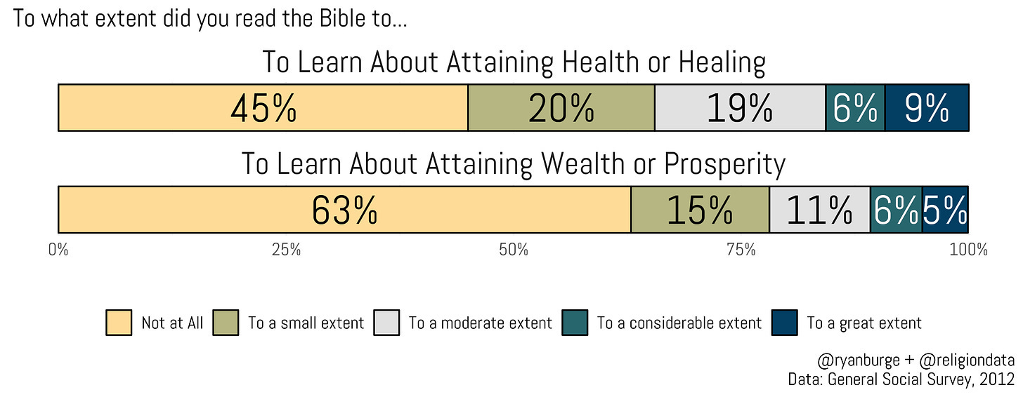 Back in 2012, the General Social Survey included a special module of questions that is housed by the Association of Religion Data Archives that specifically focused on issues related to views of the Bible and theology. There are two questions that tap into some of the basic tenets of prosperity theology.