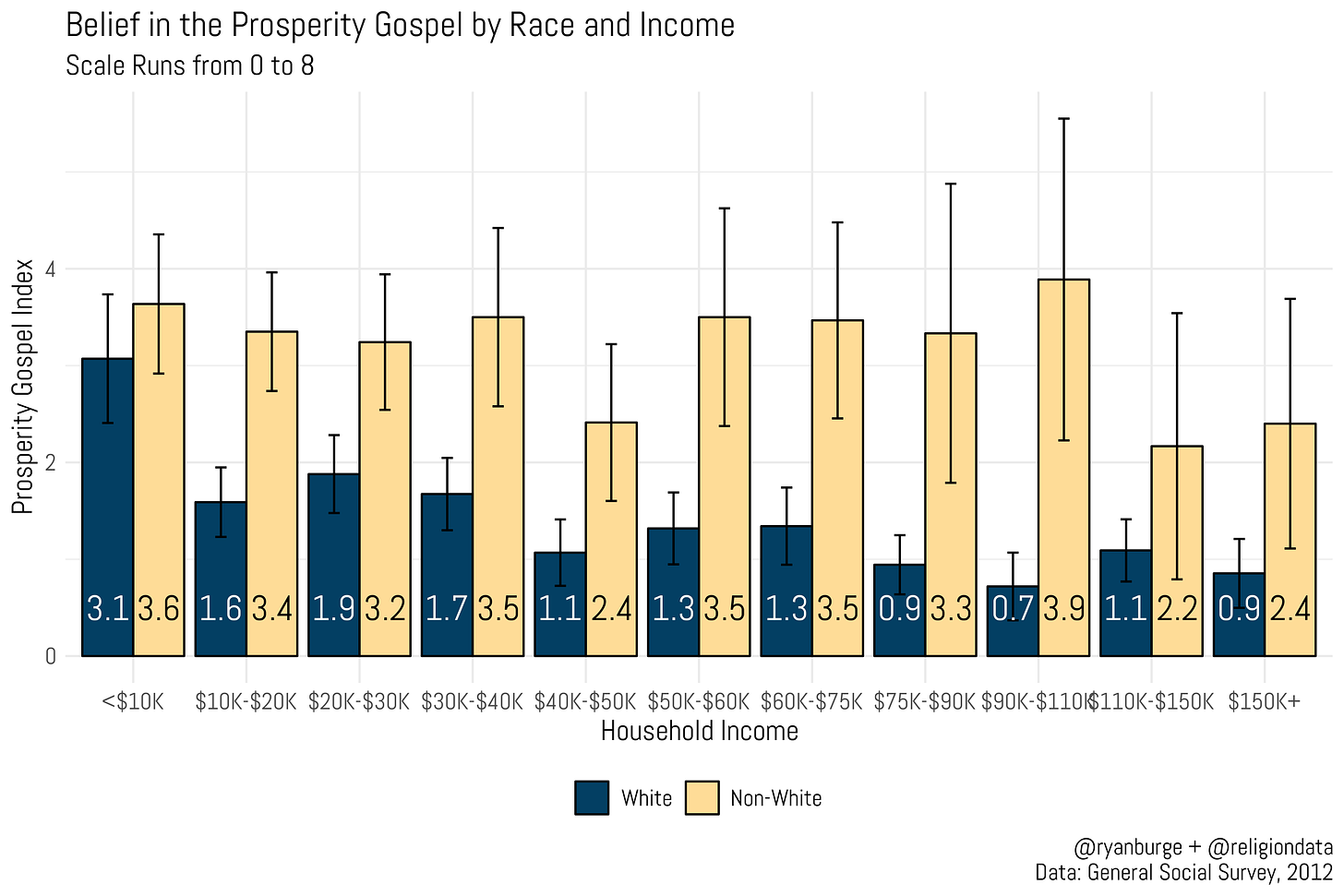 Unfortunately, the sample is not large enough to dig into specific racial groups (Black, Hispanic, Asian, etc.). There is ample evidence in the scholarly literature that the Black Church has a much stronger strain of prosperity theology than white Christian traditions - Kate Bowler’s book Blessed is an accessible entry point to this larger literature.