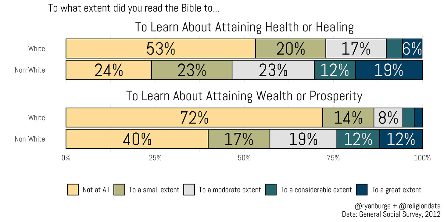 Just six percent of white Christians chose one of the top two options when it comes to learning about prosperity from the Bible, it was 24% of non-white Christians. There’s just no escaping this conclusion - reading the Bible to learn about attaining health, healing, wealth, or prosperity is more pervasive among American Christians of color. It could be that the different historical experiences of non-white American Christians has encouraged them to come to the Bible with different questions and expectations around health, healing, wealth, and prosperity compared to white American Christians.
