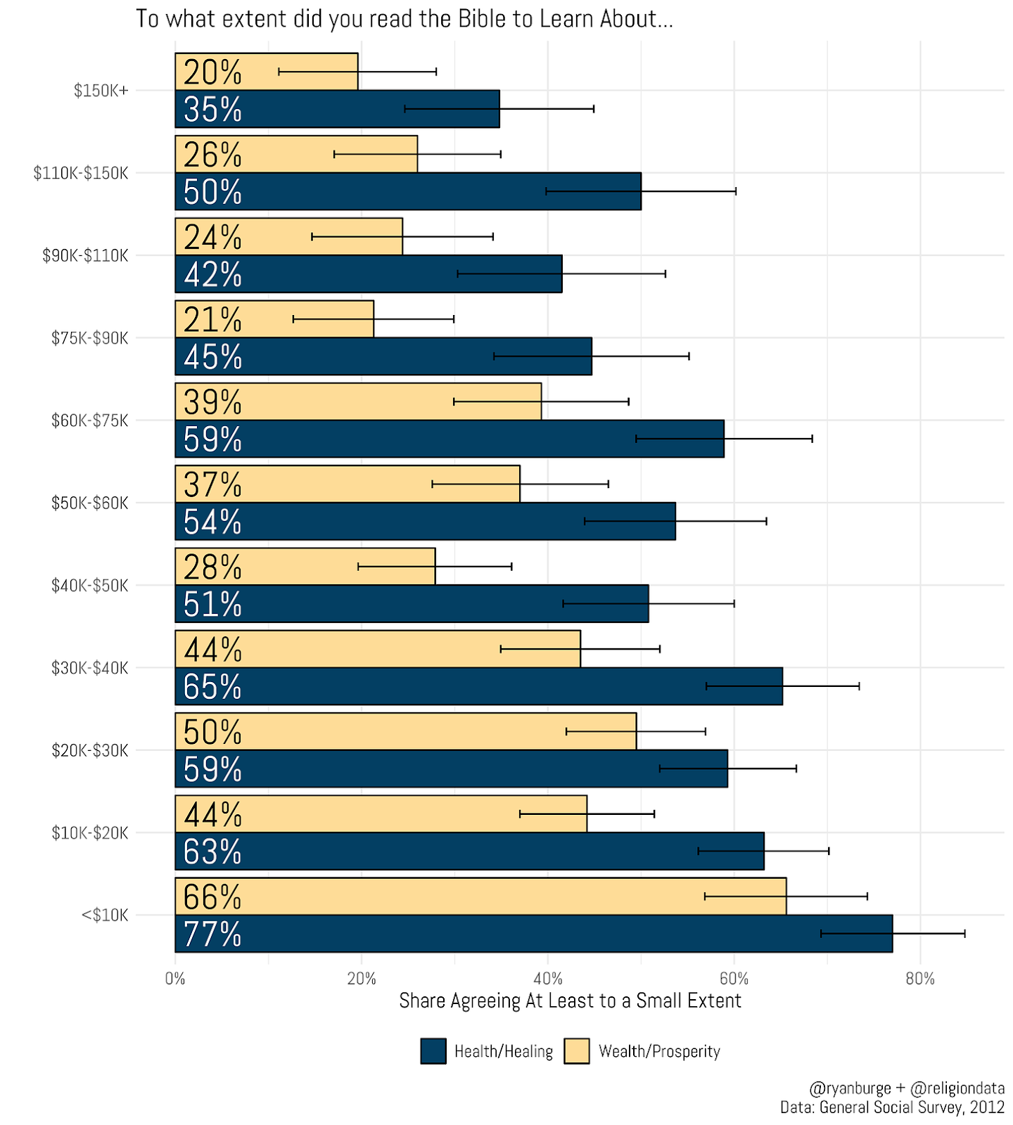 I broke the sample into a number of income brackets and then calculated the share who said that they read the Bible at least “to a small extent” to understand things like health/healing or wealth/prosperity. The results are striking - Americans at the lower end of the income distribution are much more likely to look toward the scriptures as a way to find a pathway toward prosperity. Among those making less than $40,000 a year as a household, about two-thirds said that they looked to the Bible for advice about health and healing and a bare majority said the same for wealth and prosperity.
