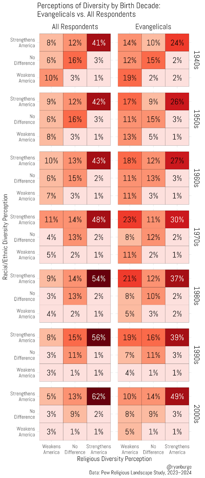 It’s 16 points among those born in the 1950s. It’s 18 points among those born in the 1970s. It’s 17 points among those born in the 1990s. And even among those folks born in the 2000s, an evangelical is 13 points less likely to think that religious and racial diversity is a good thing compared to the rest of people in their birth cohort.