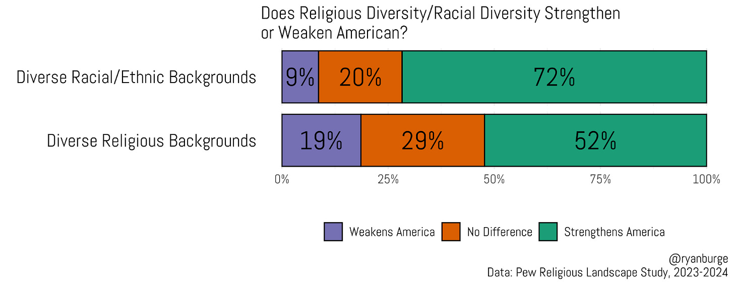 It’s even more intriguing in this instance because being around people at church (which could possibly be more racially diverse) makes people less likely to believe that diversity would strengthen the United States. That’s something worth pondering going forward.
