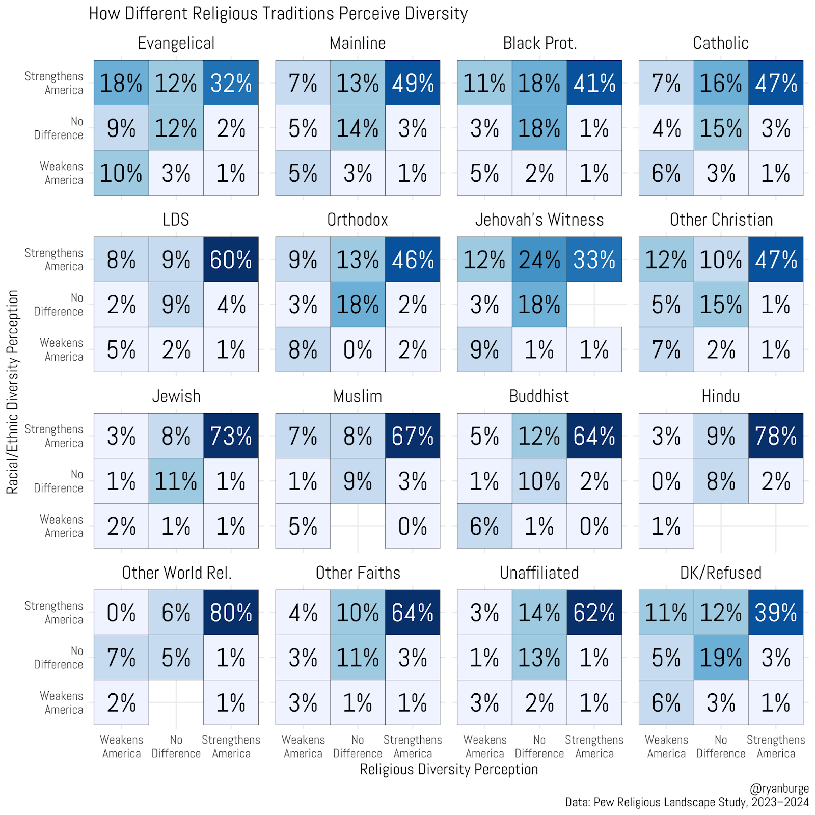 Then, if you look at the bottom two rows, you’ll see that the top right square is a darker blue. Small religious groups like Jews, Muslims, and Hindus place an incredibly high value on diversity. In each case at least ⅔ of them say that diversity (both racial and religious) are a good thing for the future of the country. Among the non-religious it’s slightly lower at 62%. But that’s still about a dozen points above the national average.