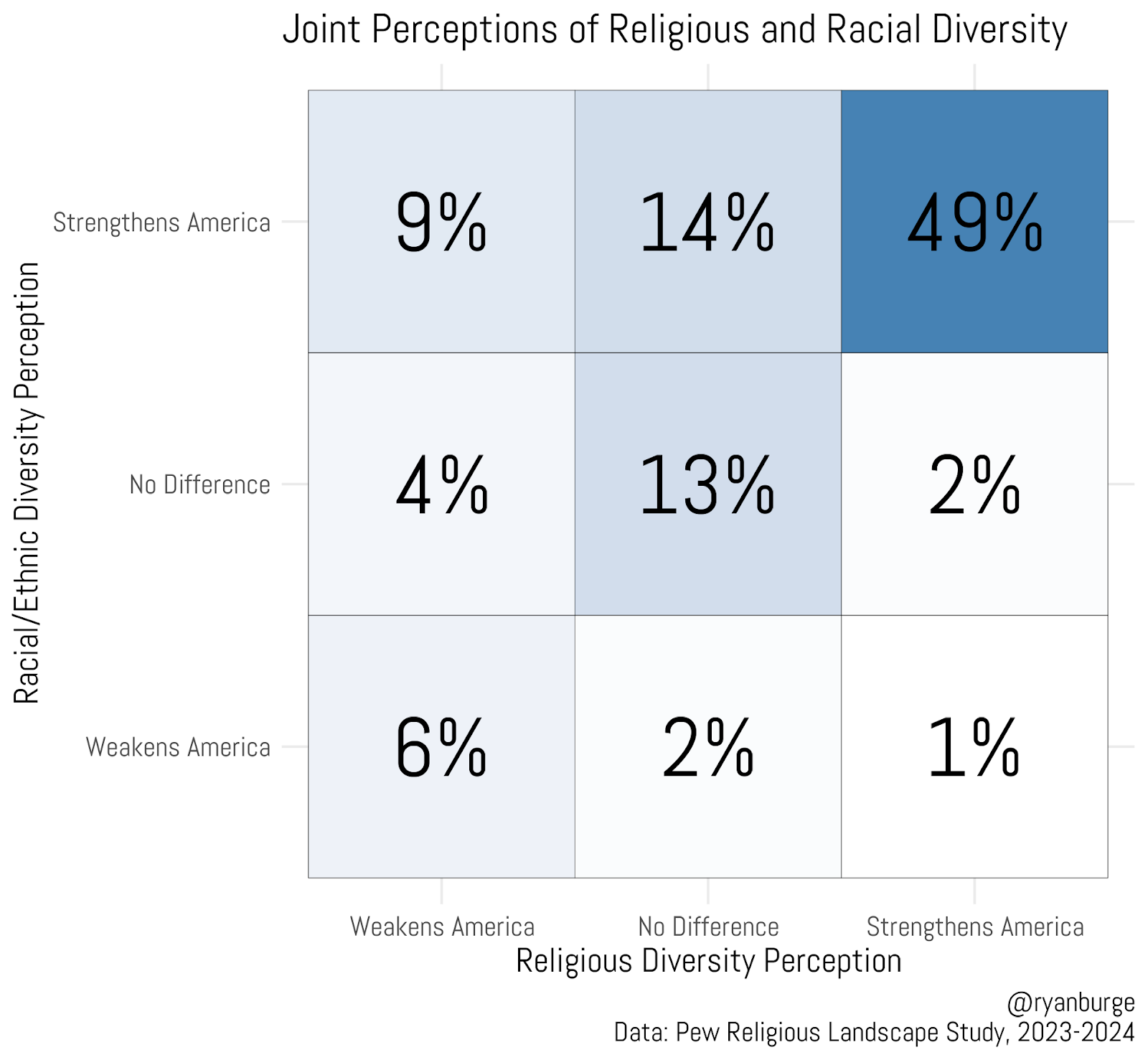 But you can see how there’s a lot more variation on the religious dimension than the racial one. For instance, 14% of the sample said that racial diversity strengthens the country but religious diversity makes no difference. What about the opposite combination? It’s just 2% of the sample. And 9% of folks say that racial diversity is a good thing but religious diversity is a bad thing. It’s only 1% of people in the exact opposite position.