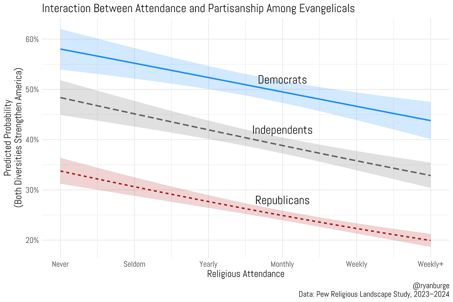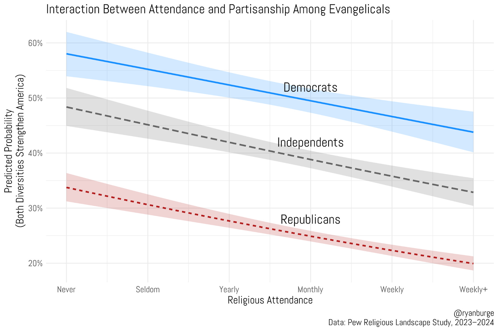 Evangelical Democrats are much more likely to embrace diversity than evangelical Republicans. I mean, the gap is a chasm. It’s about twenty-five percentage points when comparing the same level of church attendance. This is a phenomenon that is being driven largely by politics. I feel very vindicated by this as a political scientist, by the way.