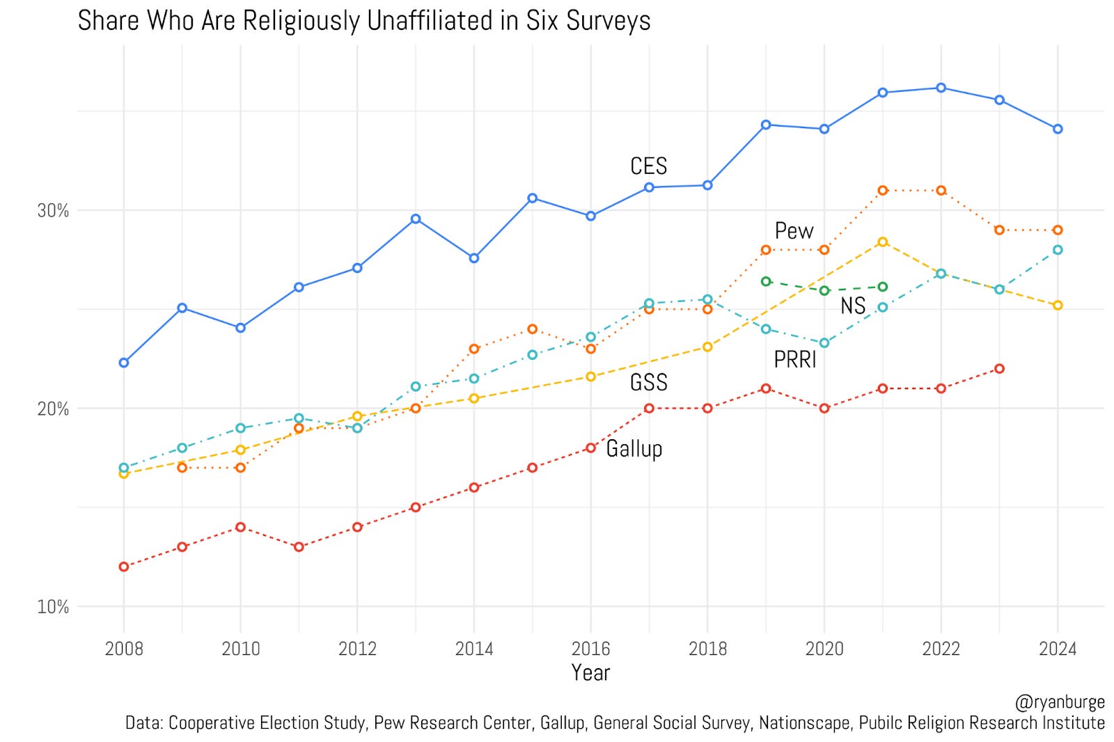Let me start by showing a simple data point: the share of the public who says that they have no religious affiliation. But I’m going to give you that figure across six different surveys that I can find strewn all over the internet. They include the Cooperative Election Study, the Pew Research Center, the Nationscape Survey, the Public Religion Research Institute survey, the General Social Survey, and the Gallup Survey.